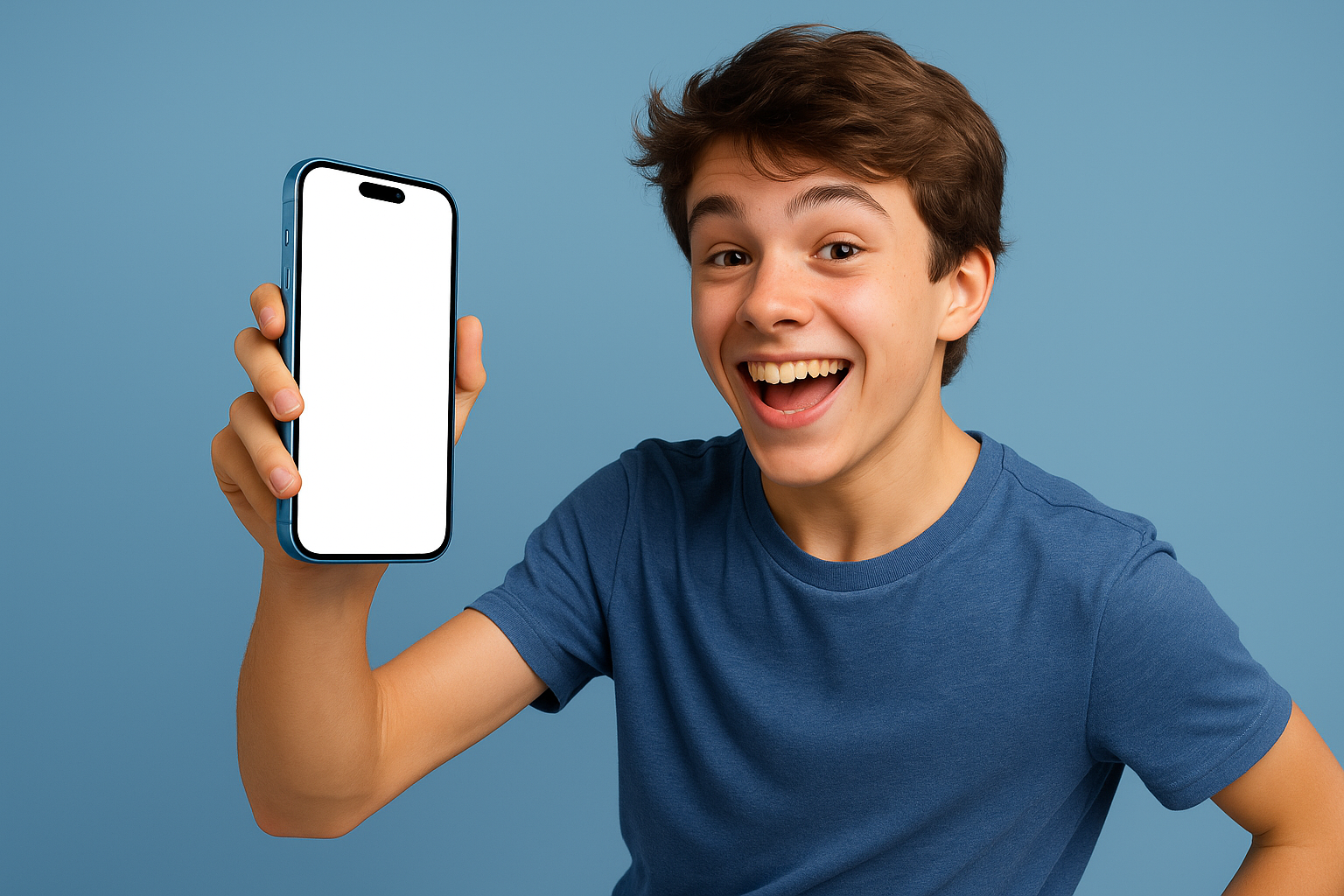A cheerful teenage boy is holding a blue smartphone with a blank white screen. He is smiling broadly against a solid blue background, showcasing excitement.