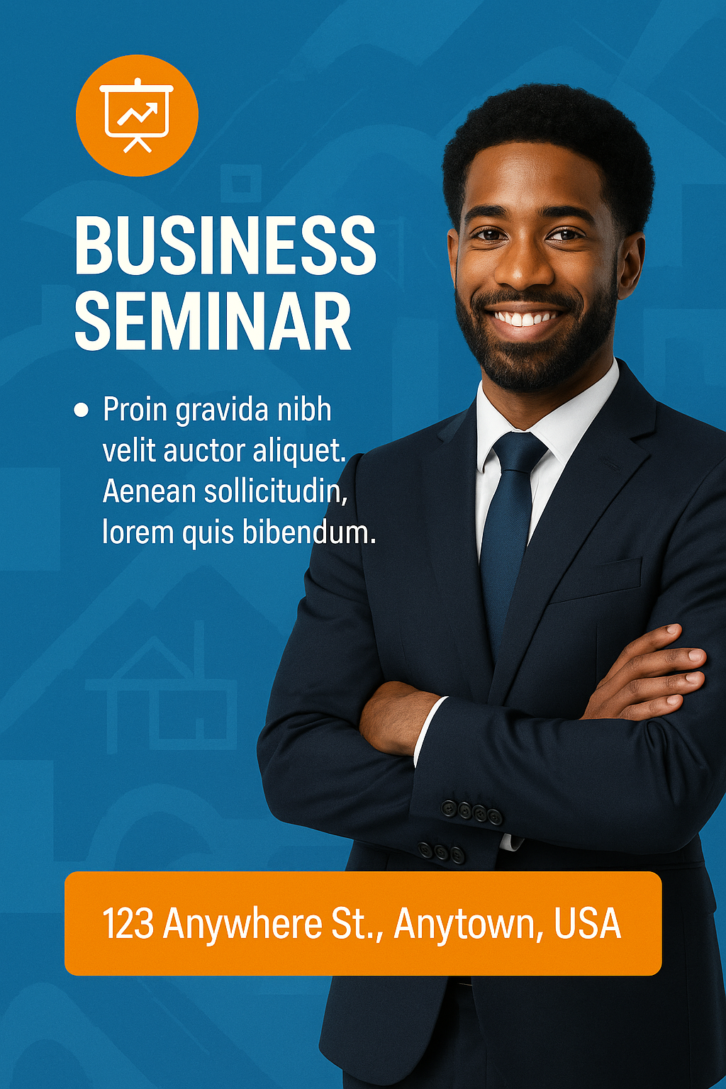 Business Seminar Promotional Graphic Featuring Speaker and Chart