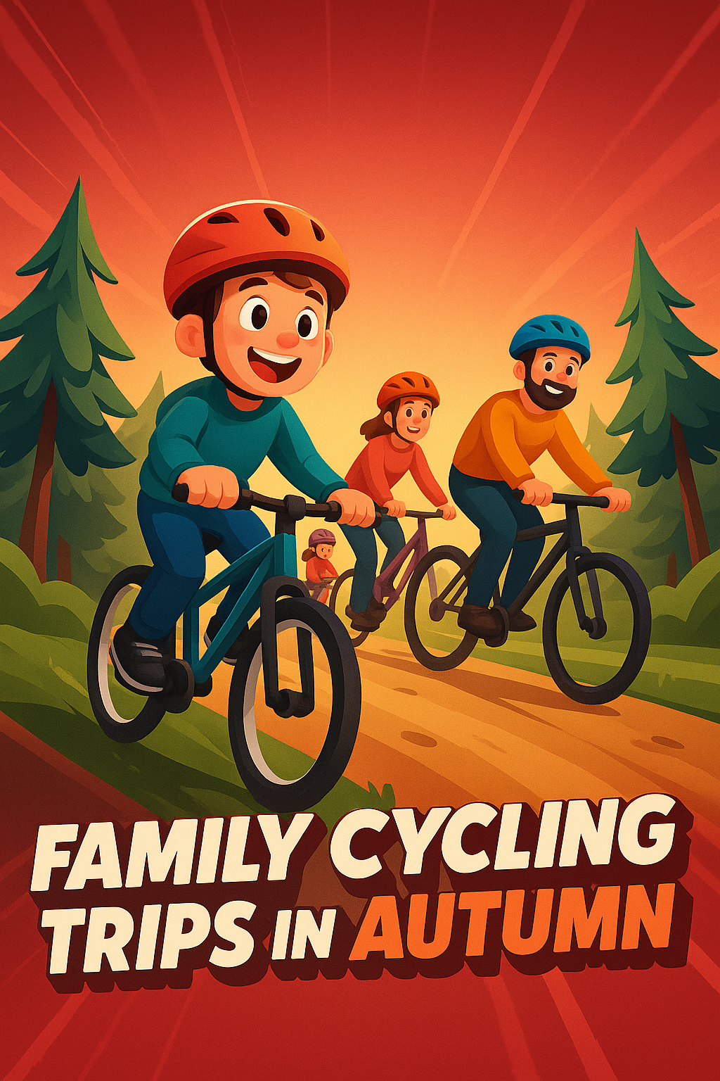 A lively illustration showcasing a family cycling together on a forest path during autumn. The scene features dynamic colors and playful characters, emphasizing active recreation.