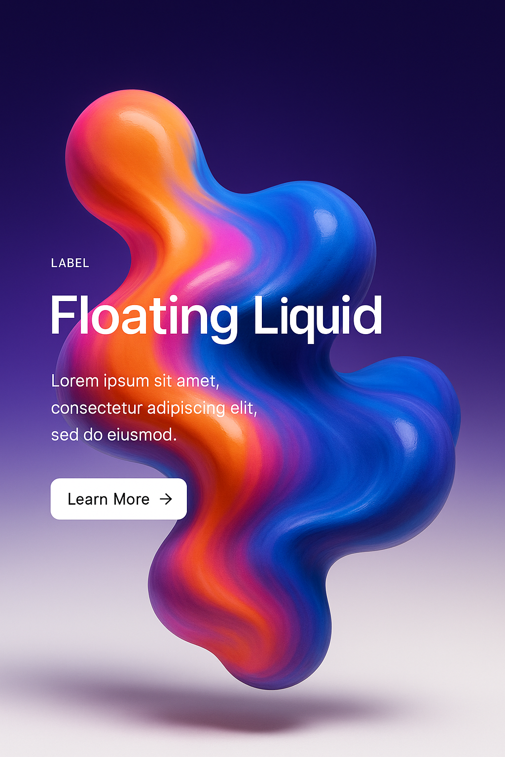 /Collection: /by davooda/Type: PNG/A vibrant illustration of a colorful floating liquid in pink, orange, blue, and violet hues. The design features text elements including a label, title, and action button, set against a gradient background.