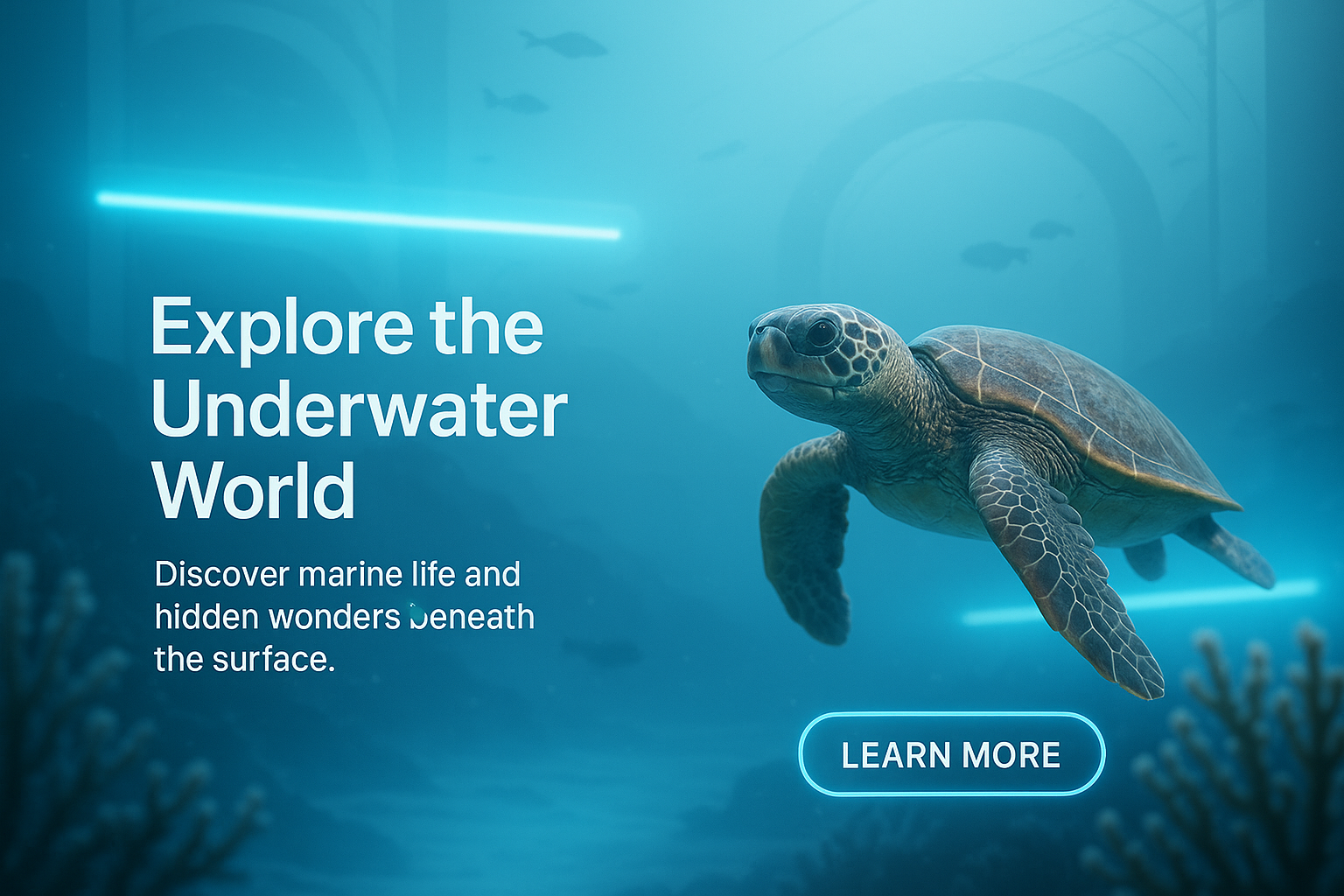 Underwater Exploration Promotional Graphic Featuring a Sea Turtle
