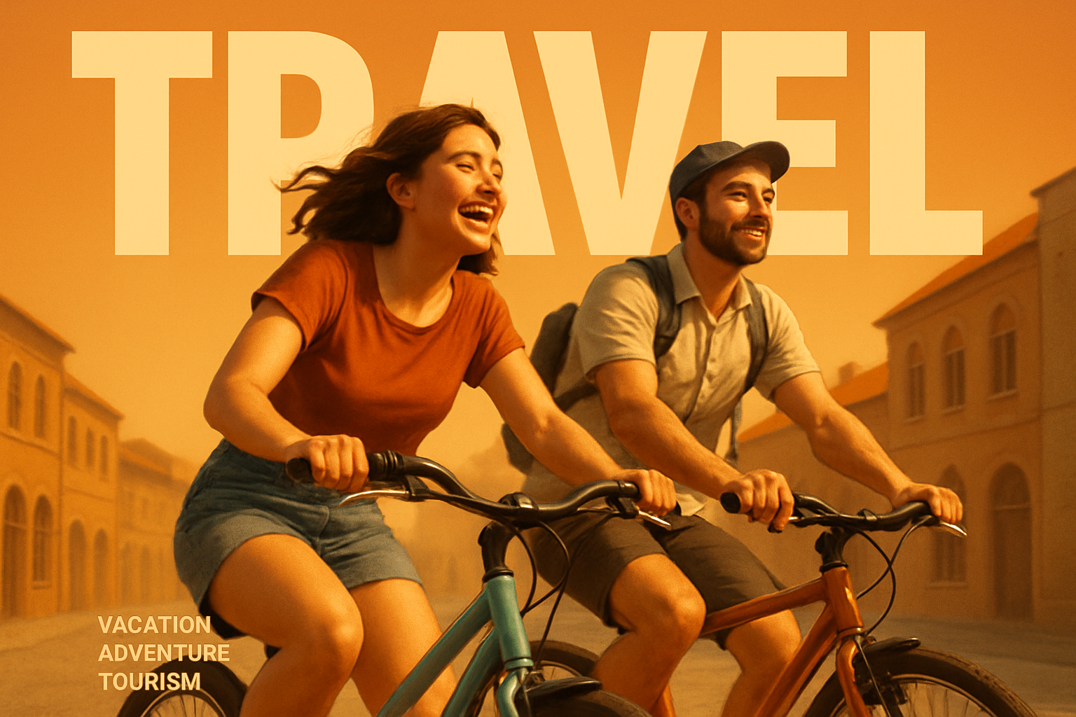 A girl and a man joyfully ride bicycles through an old city, featuring a modern and cinematic style. The vibrant background enhances the travel theme.