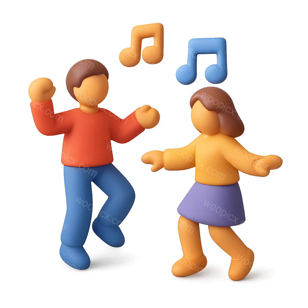 A vibrant 3D icon featuring two stylized figures dancing joyfully against a blurred background with music notes above them, creating a lively atmosphere.