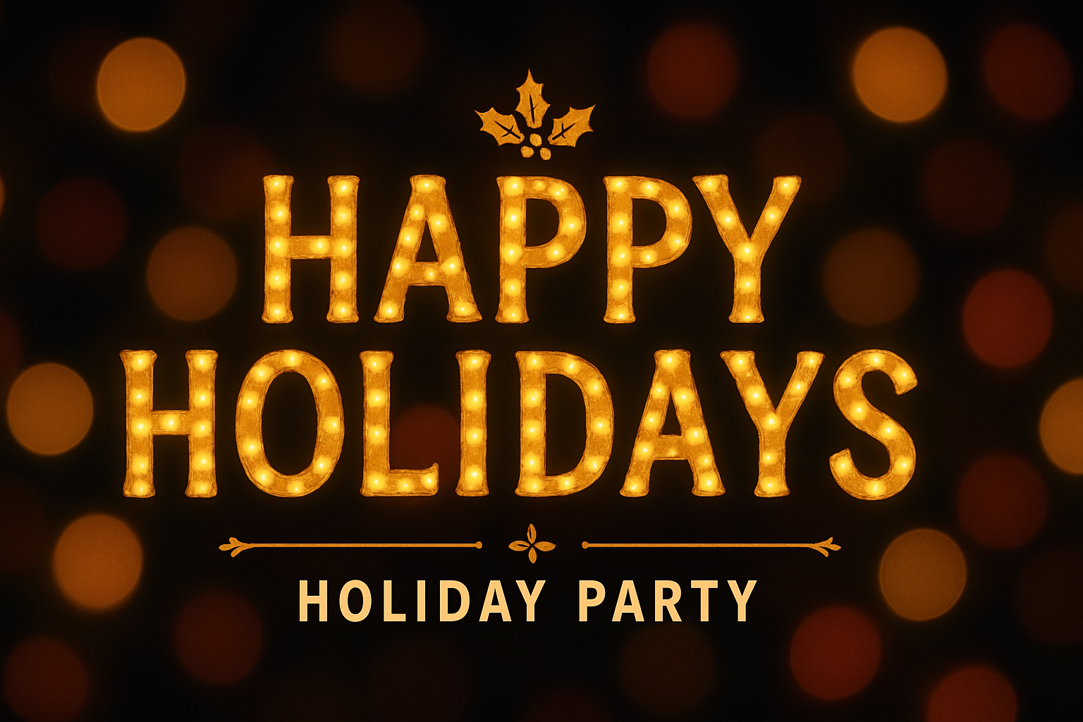 Inviting holiday party graphic featuring illuminated text on a bokeh background, ideal for seasonal celebrations and event promotions.
