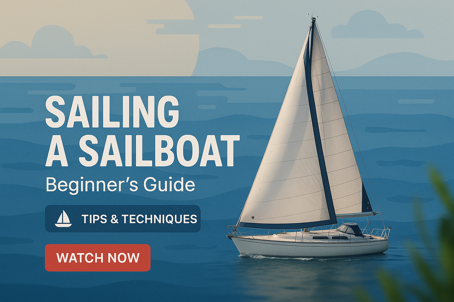 Informative promotional graphic showcasing a sailboat with a serene background, ideal for a beginner's guide on sailing, emphasizing tips and techniques.