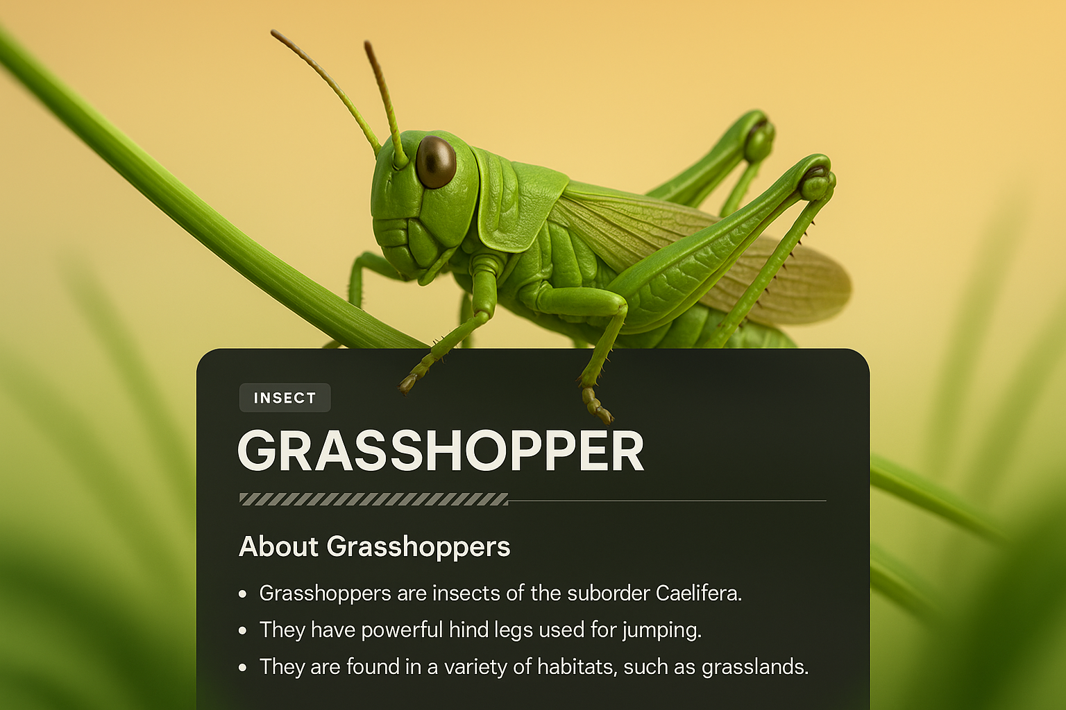 /Collection: /by davooda/Type: PNG/A detailed 3D illustration of a grasshopper set against a gradient background. It features an informative overlay with text about grasshoppers, seamlessly integrated with the visual.