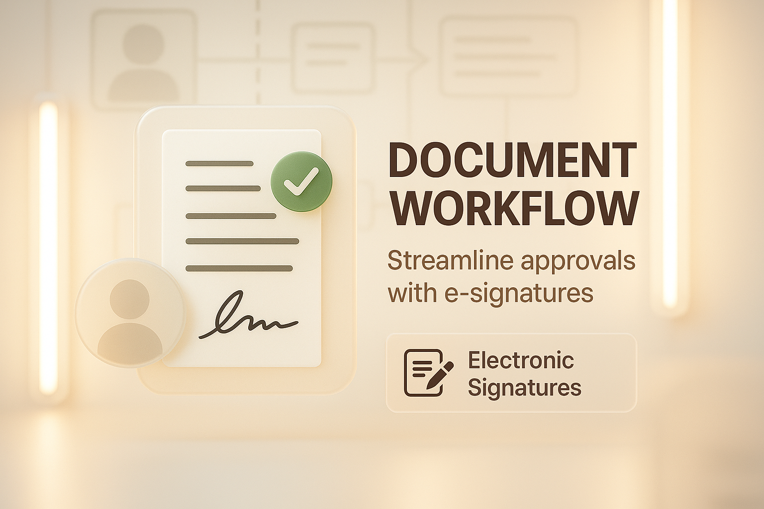 /Collection: /by davooda/Type: PNG/Modern digital illustration depicting a document workflow with electronic signatures, featuring sleek design elements suitable for business presentations or marketing materials.