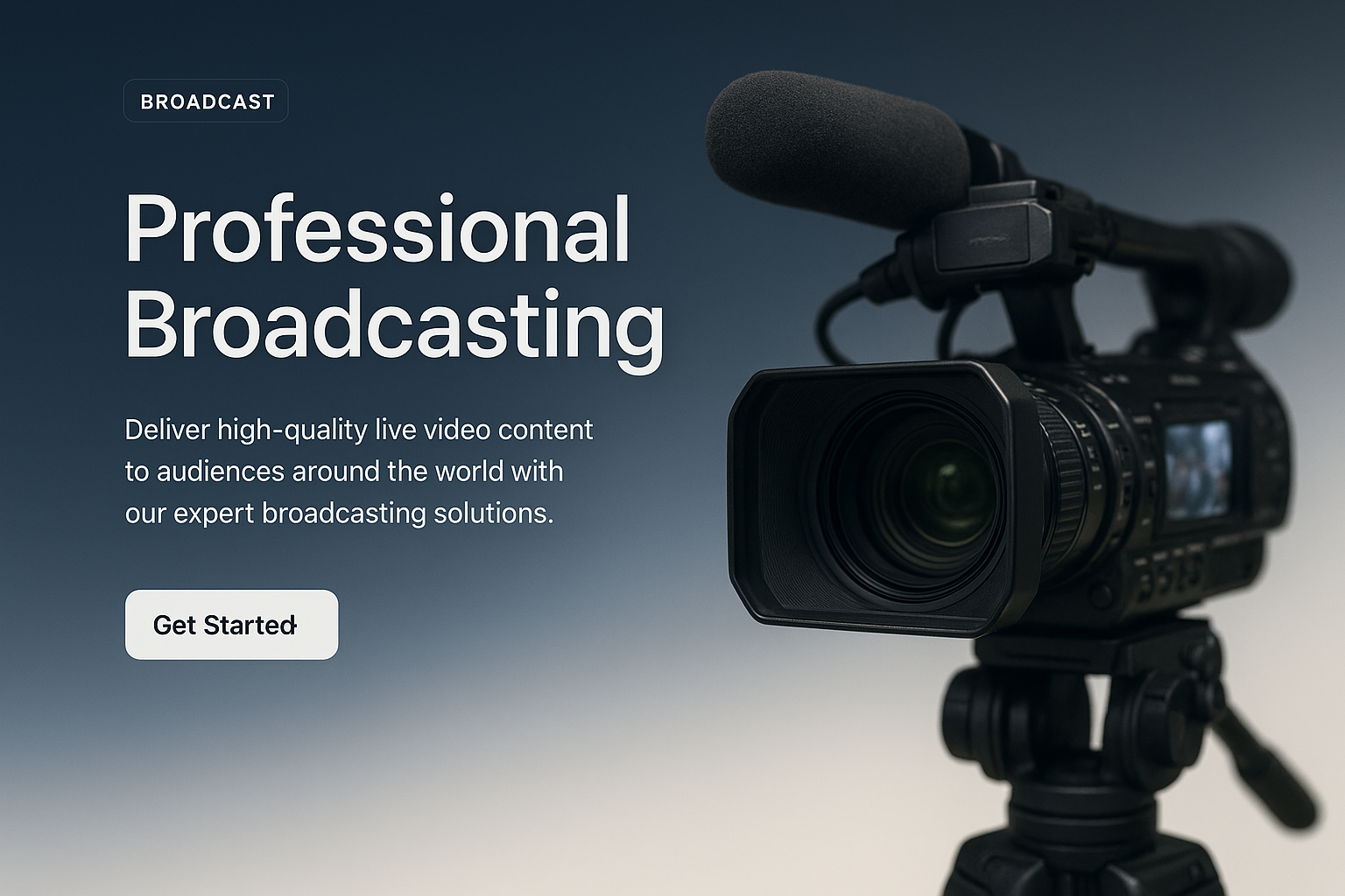 A sleek web design featuring a professional video camera, emphasizing high-quality broadcasting services with a clear call-to-action button.