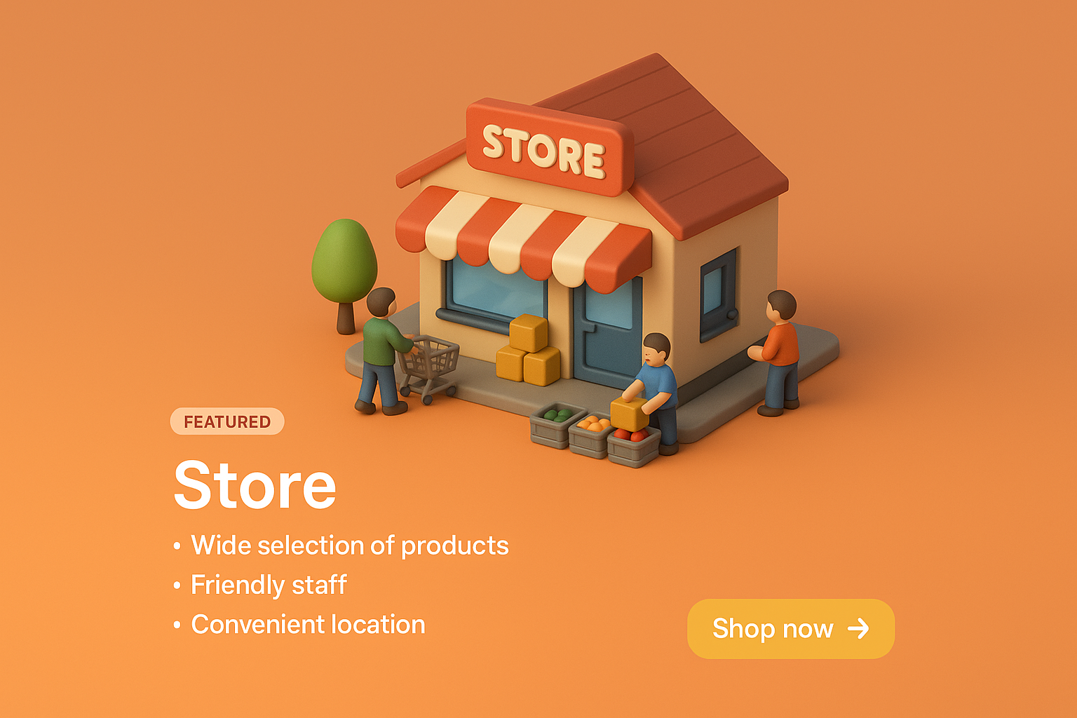 A zoomed-out 3D illustration of a miniature store featuring characters interacting with products. The scene showcases vibrant colors and a cohesive design.