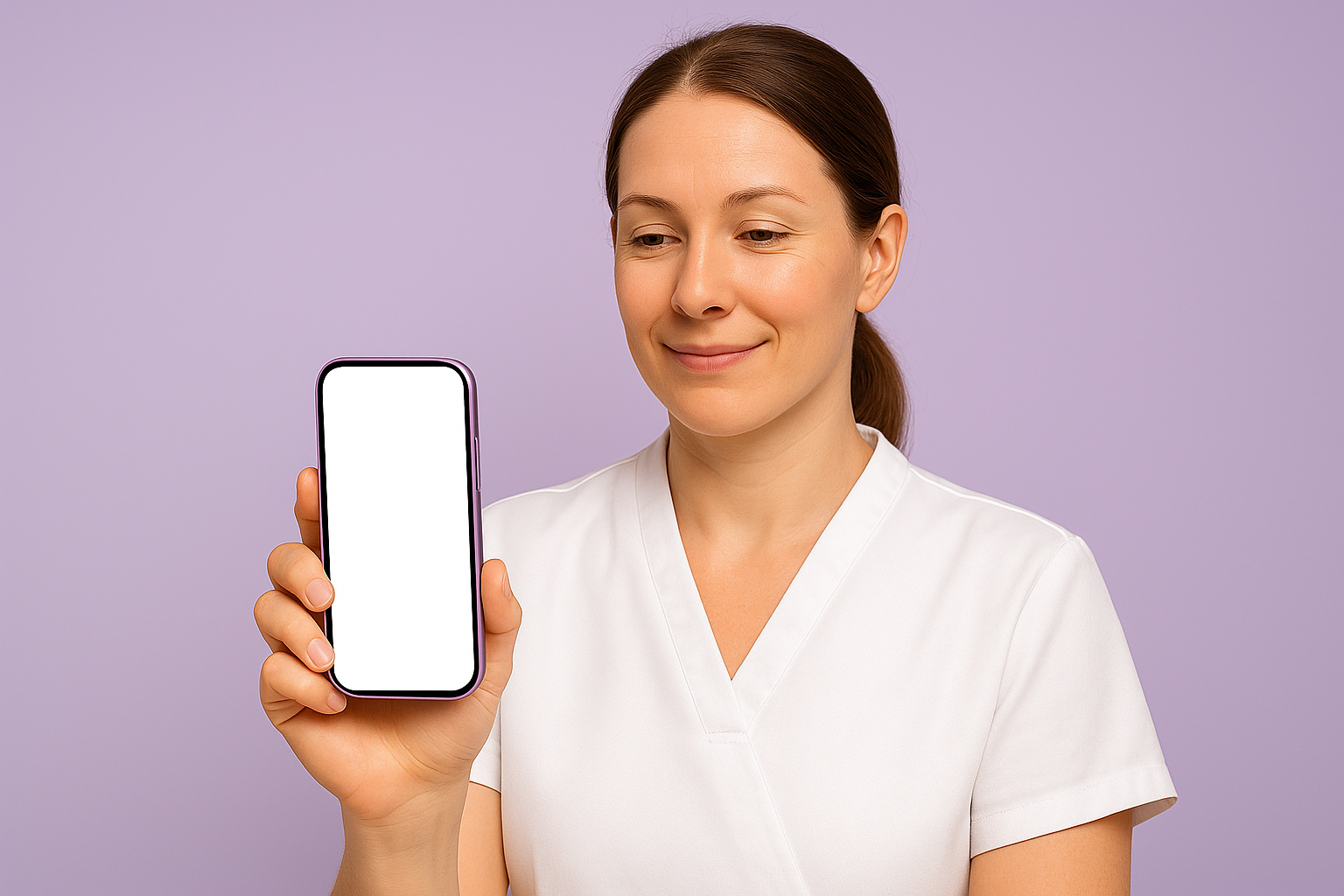 A female massage therapist in a white uniform is holding a purple smartphone with a white screen. She appears relaxed and is smiling against a soft purple background.