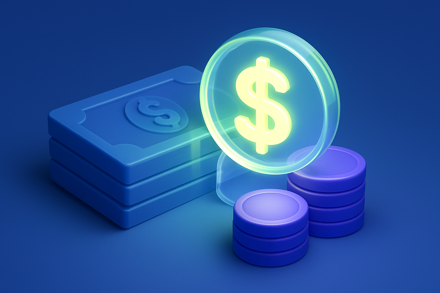 Glowing 3D Icon of Dollar Sign with Cash and Coins