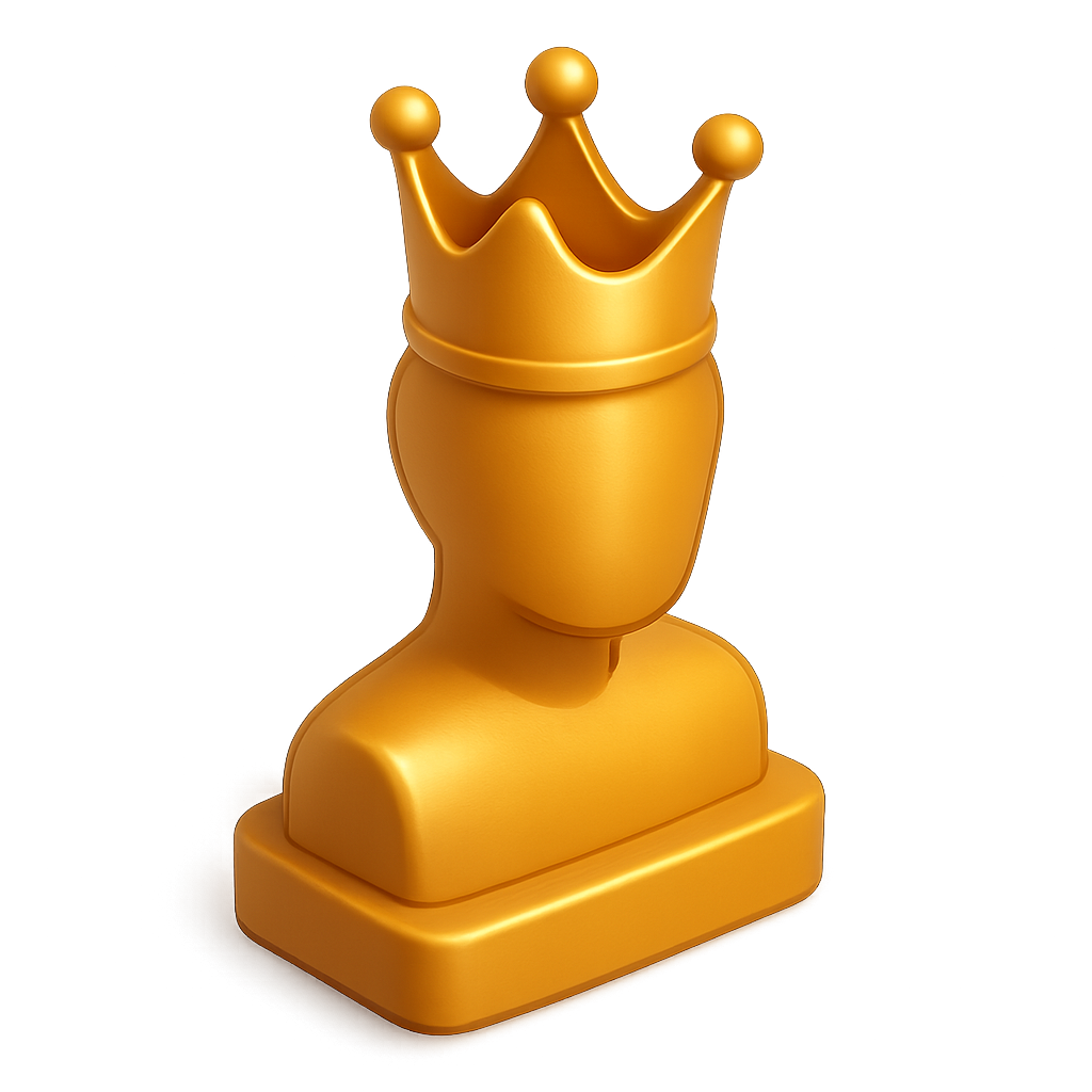 A polished gold 3D icon representing a crown atop a stylized bust. The design features smooth curves and a modern aesthetic, ideal for branding.