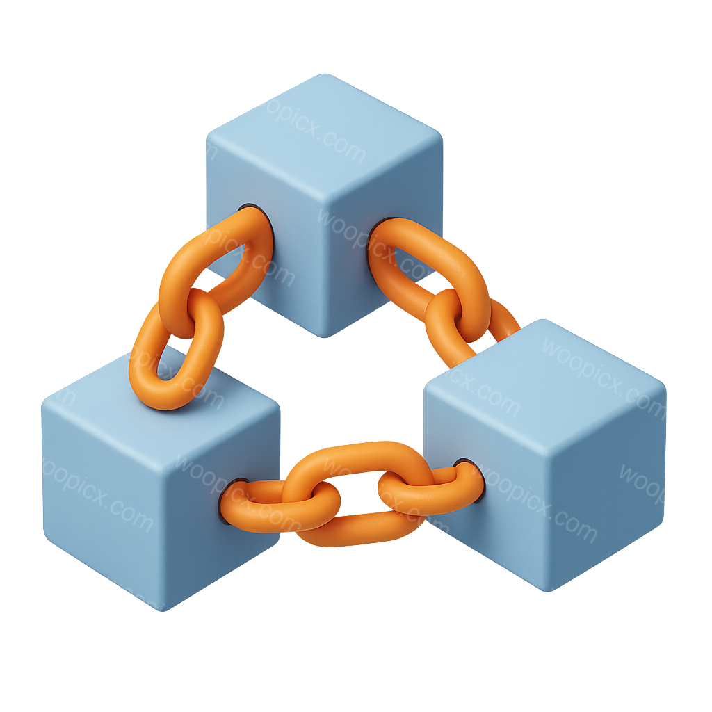 /Premium/Collection: /by davooda/Type: PNG/A visually striking 3D icon representing blockchain technology, featuring interconnected cubes and orange chains. The design is isometric with a transparent background, creating a modern feel.