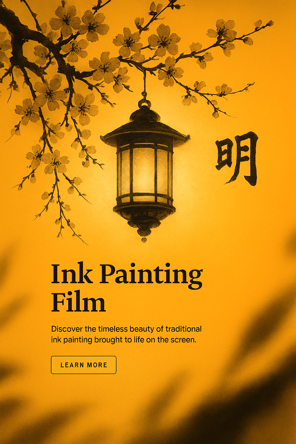 This is a promotional social media post showcasing an ink painting film. The graphic features a lantern and cherry blossoms with a warm color palette, appealing to art enthusiasts.