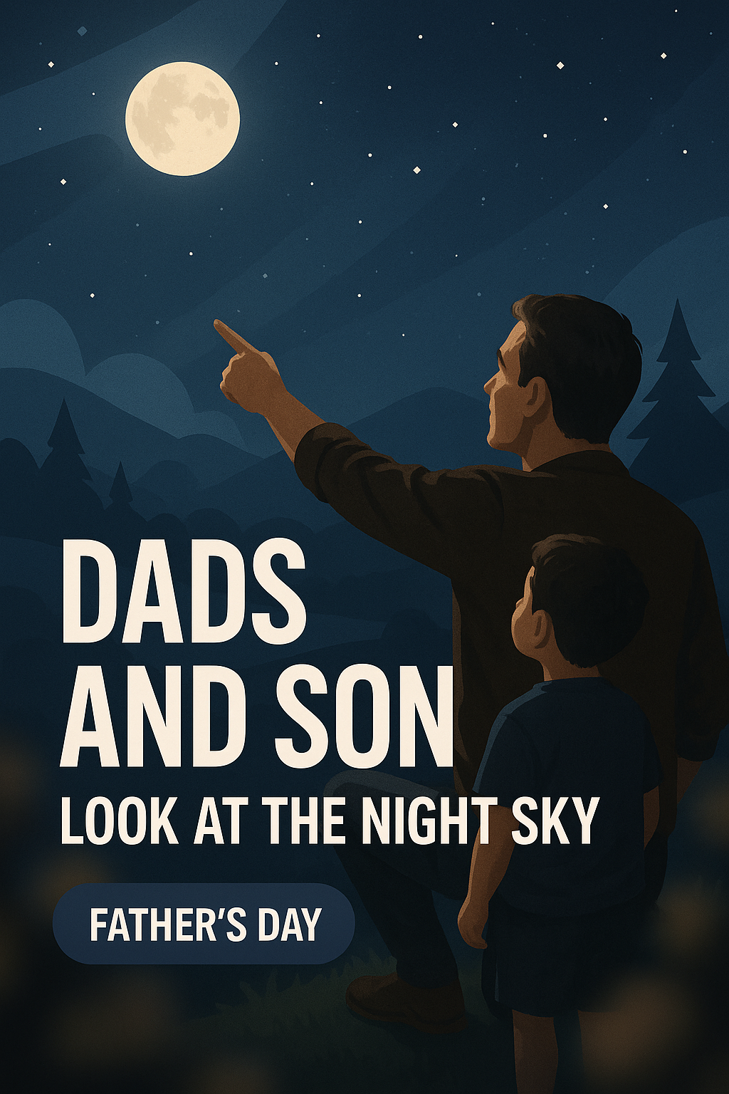 A heartwarming illustration depicting a father and son pointing at the moon under a starry night sky, ideal for Father's Day promotions or family-themed content.