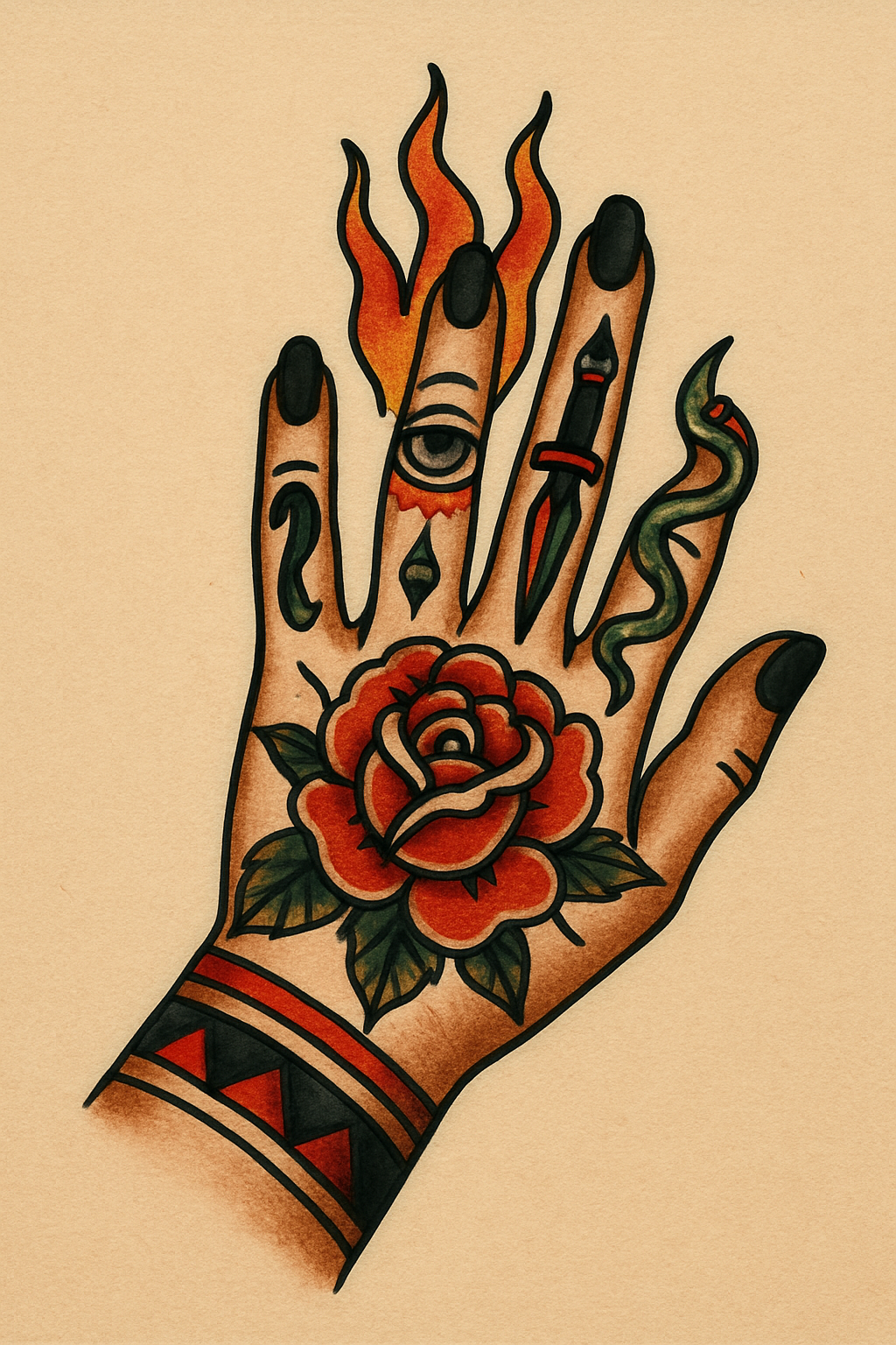 Colorful Tattoo Design of a Hand with Floral and Symbolic Elements