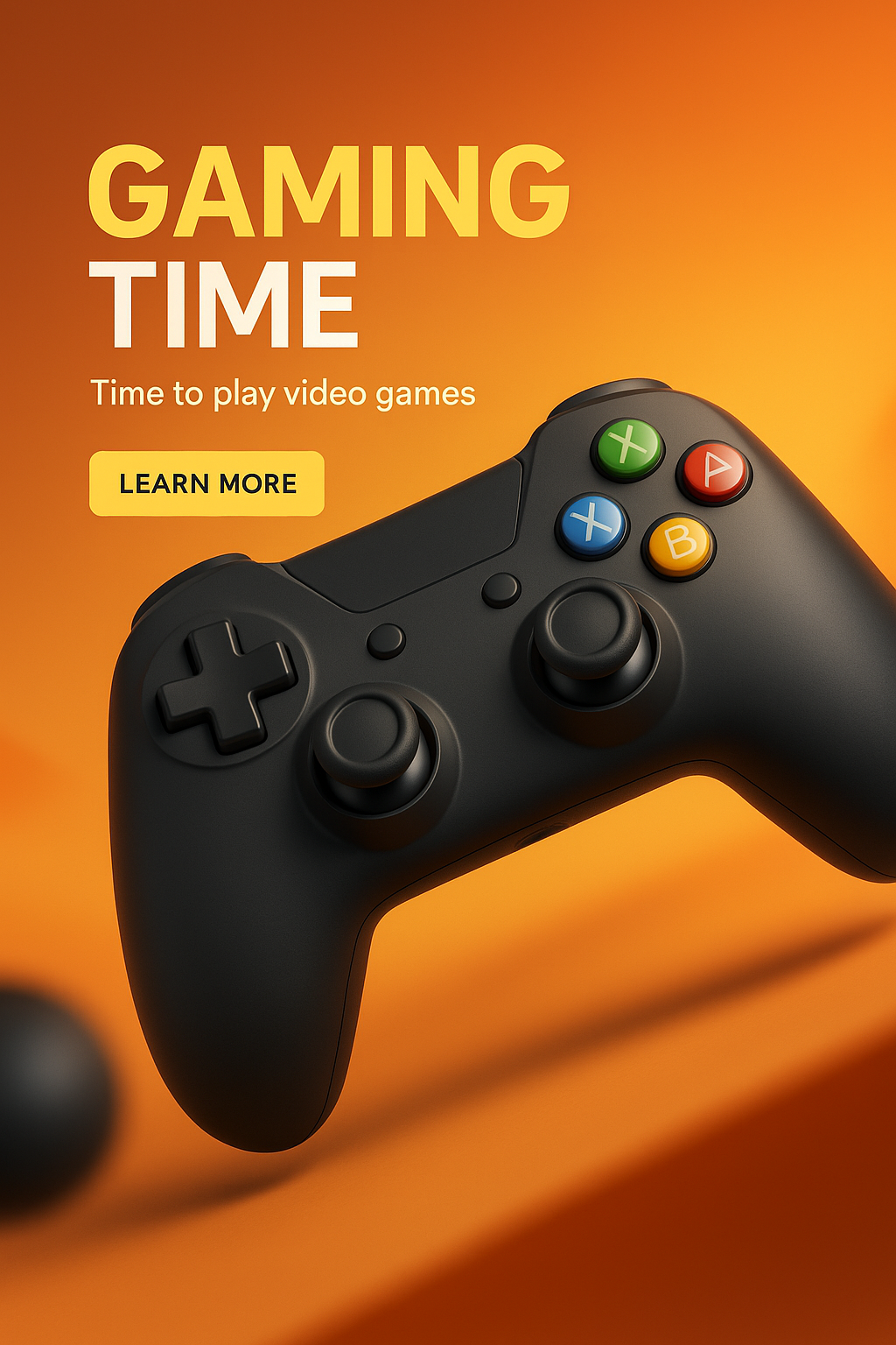 /Collection: /by davooda/Type: PNG/A promotional image featuring a gaming controller against a bright orange background, ideal for advertising video games or gaming events. The design combines modern aesthetics with a playful theme.