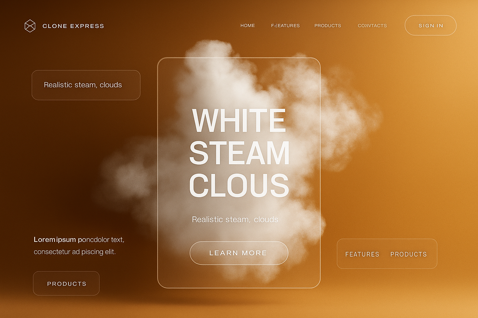 /Collection: /by davooda/Type: PNG/A visually striking landing page design featuring a white steam cloud on a vibrant gradient background. The layout incorporates layered glass panels, a call-to-action button, and sections for products and features.
