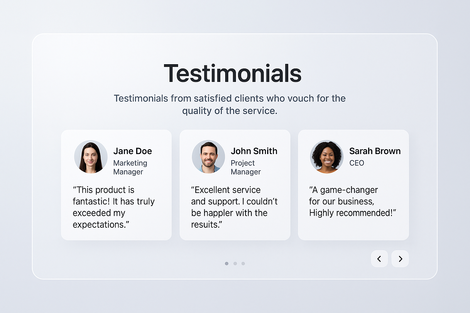 /Collection: /by davooda/Type: PNG/A modern testimonials section featuring three client feedback cards with circular author photos, names, positions, and testimonial texts, designed for web integration.