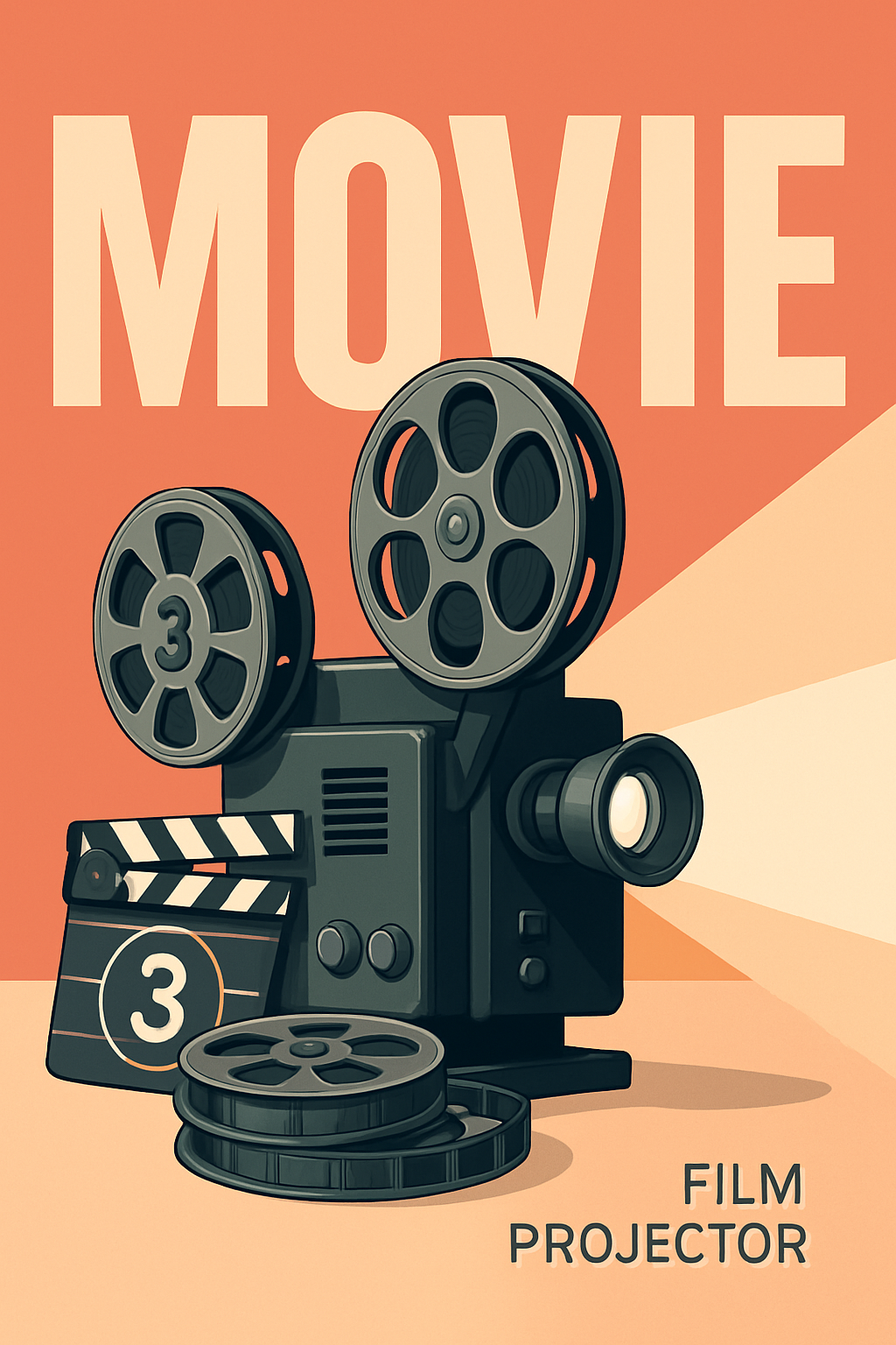 /Collection: /by davooda/Type: PNG/A hyper-realistic vector illustration of a film projector and clapperboard. The design features bold typography and a modern color palette with minimalistic layout elements.