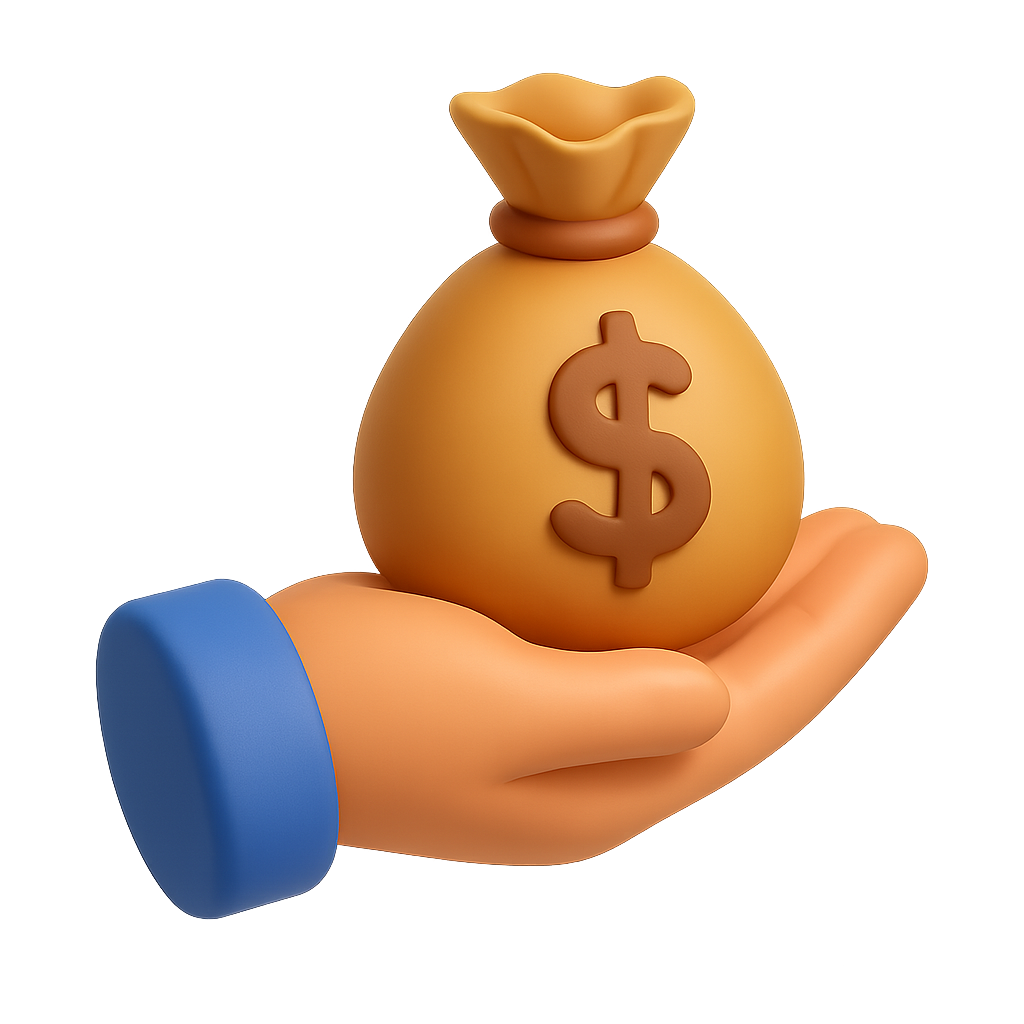 A stylized 3D icon of a hand holding a money bag, featuring a dollar sign. The design is volumetric with a transparent background and a three-quarter view.