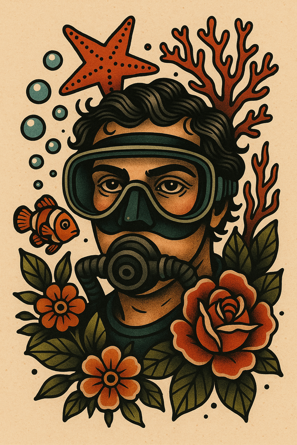 Illustrative Portrait of a Diver Surrounded by Marine Life
