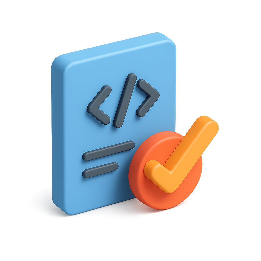 A vibrant 3D icon depicting a code snippet with a checkmark, designed in a three-quarter isometric view. The blue background enhances its modern aesthetic.
