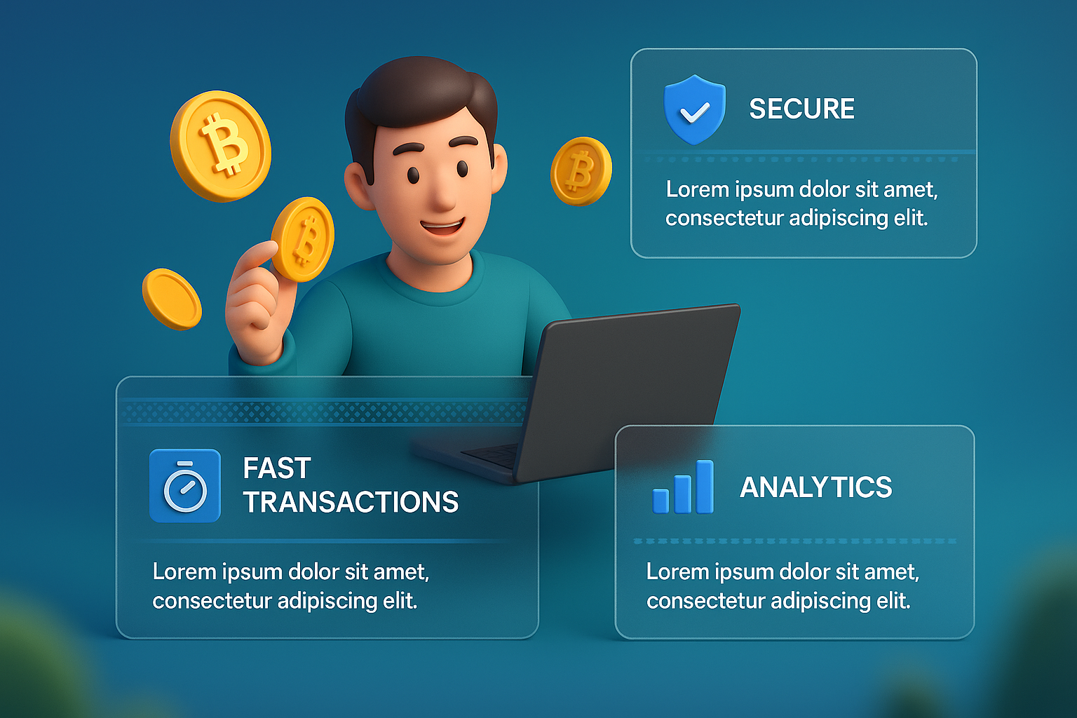 /Collection: /by davooda/Type: PNG/A 3D illustration featuring a man with coins and a laptop, highlighting crypto features like security, fast transactions, and analytics within distinct blocks.