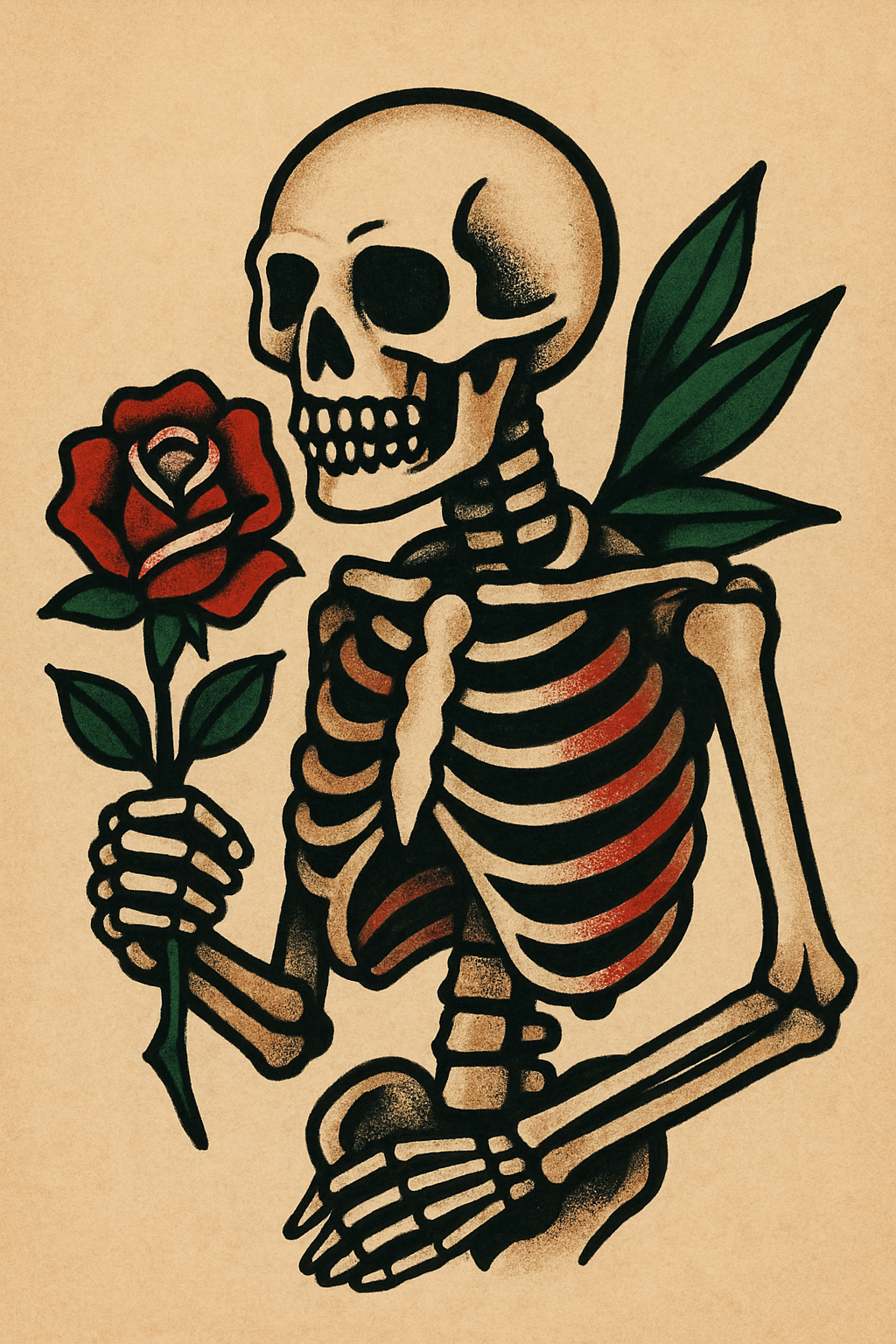 Tattoo Design Featuring Skeleton, Rose, and Sword