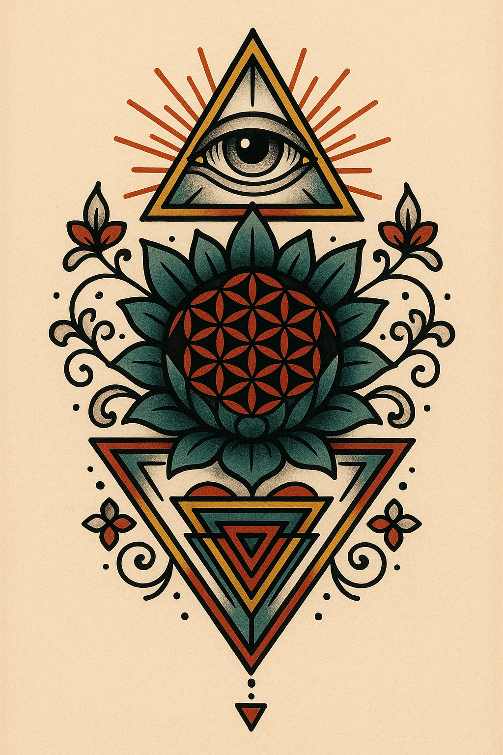 /Collection: /by davooda/Type: PNG/This is a detailed illustration featuring spiritual symbols including an eye, flowers, and geometric shapes. The design uses bold colors and intricate patterns, intended for art enthusiasts and spiritual contexts.