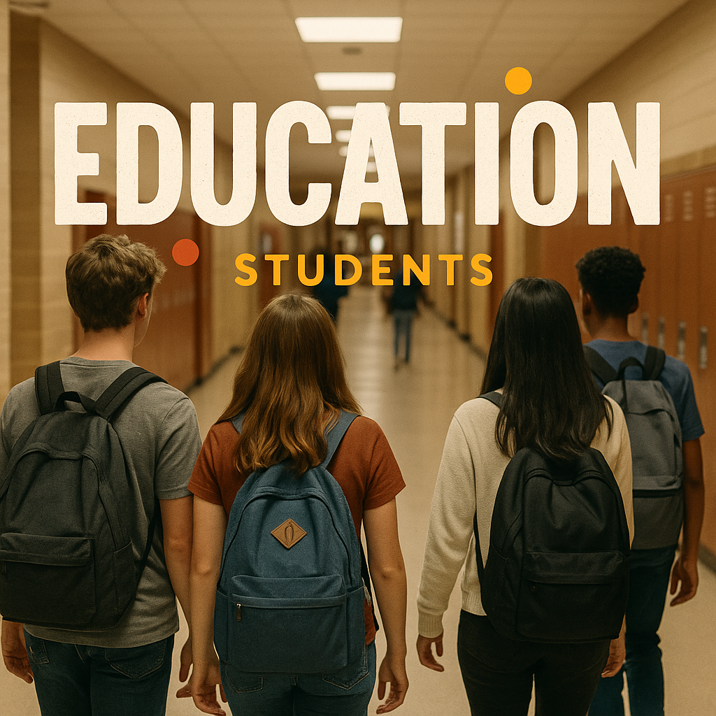 /Collection: /by davooda/Type: PNG/A social media post capturing four students walking through a school hallway, emphasizing the theme of education. The design features bold typography, making it suitable for educational campaigns or social media content.