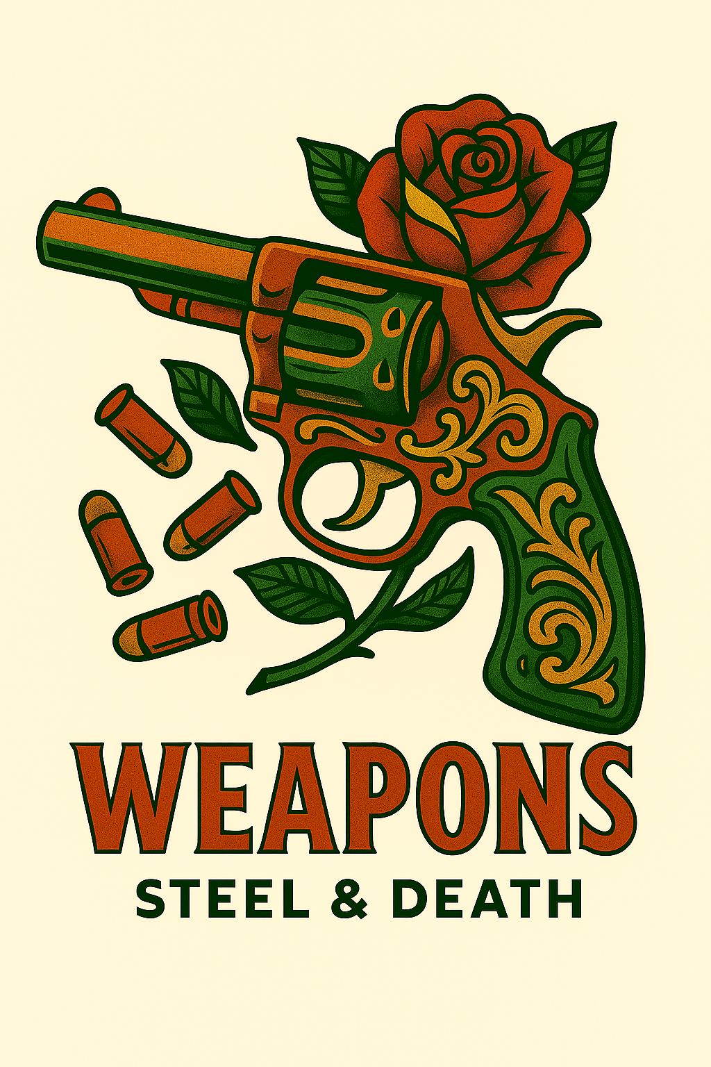 A bold and artistic illustration combining a revolver with decorative elements and a rose. Ideal for merchandise related to tattoo culture or edgy fashion.