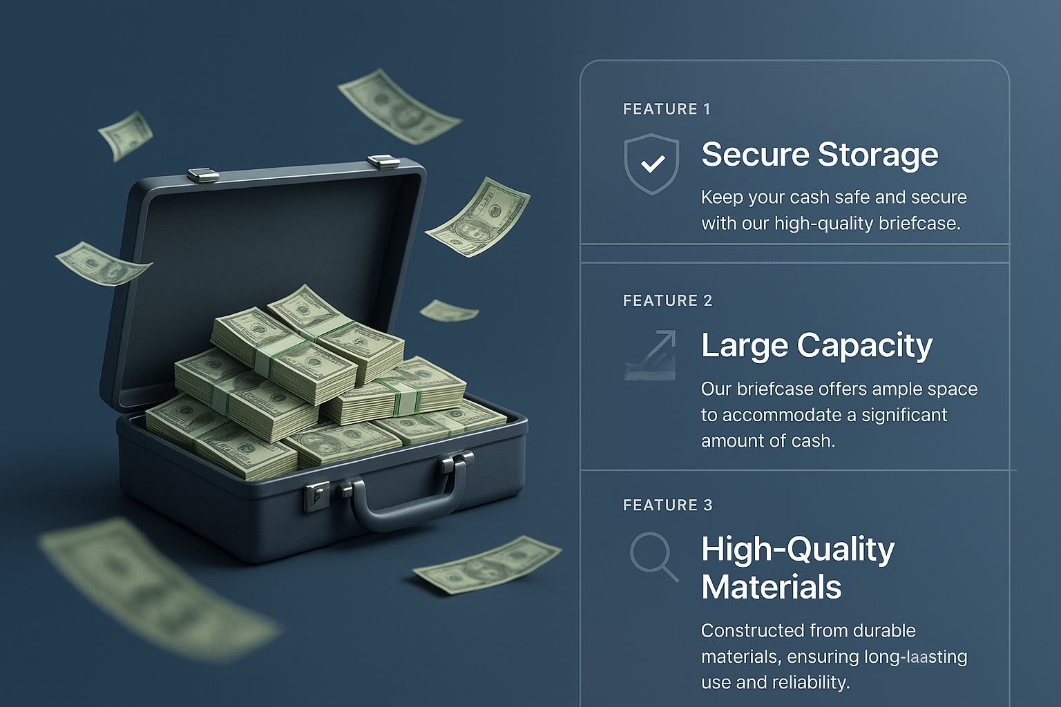 A 3D illustration of a briefcase filled with cash, showcasing features like secure storage, large capacity, and high-quality materials in a sleek design.