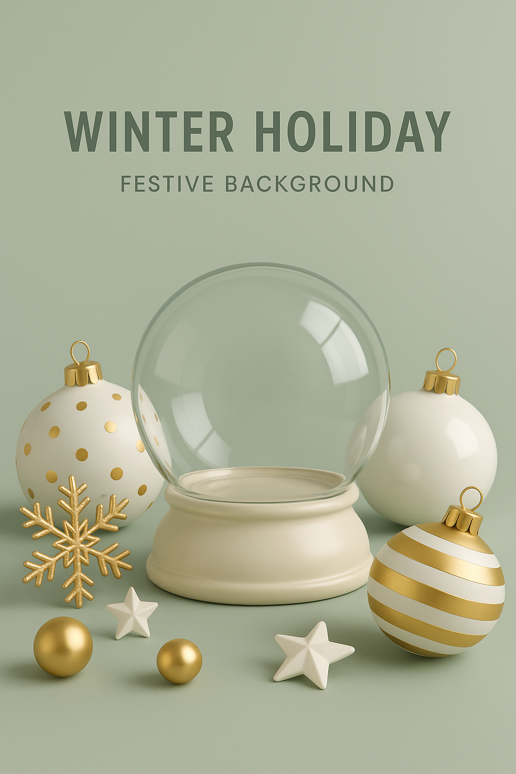 Charming winter holiday background featuring a snow globe and various decorative ornaments, perfect for seasonal marketing and festive celebrations.