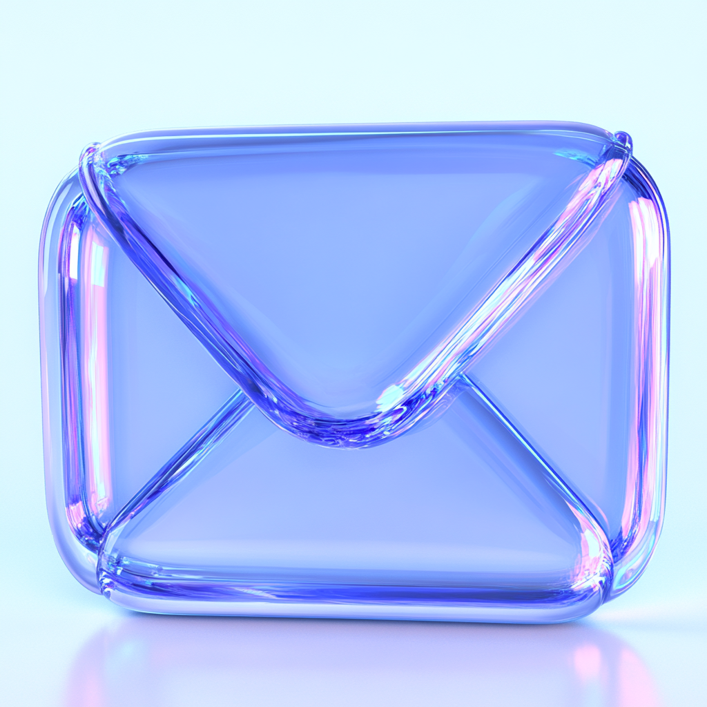 A modern 3D representation of an email envelope icon with a glossy, translucent finish. The design features soft purple hues, making it suitable for digital communications or tech branding.