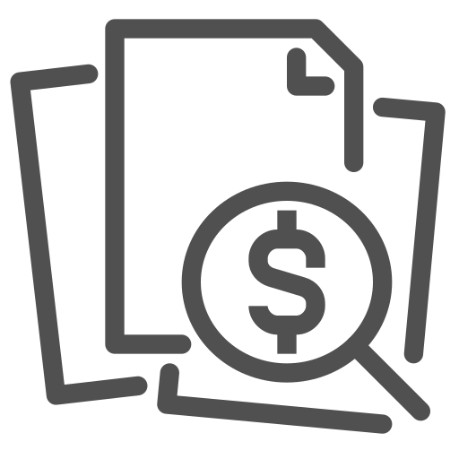 outline simple icon: analytics, data, documents, financial analysis, magnifying glass