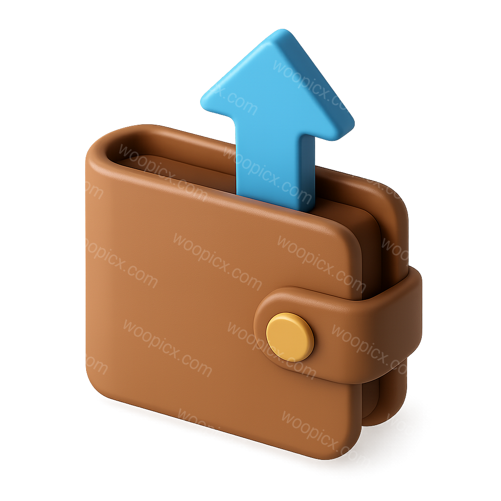 /Premium/Collection: /by davooda/Type: PNG/A stylized 3D wallet in brown with a blue upward arrow emerging from it, symbolizing growth. The design features a three-quarter view with a glossy finish, set against a transparent background.