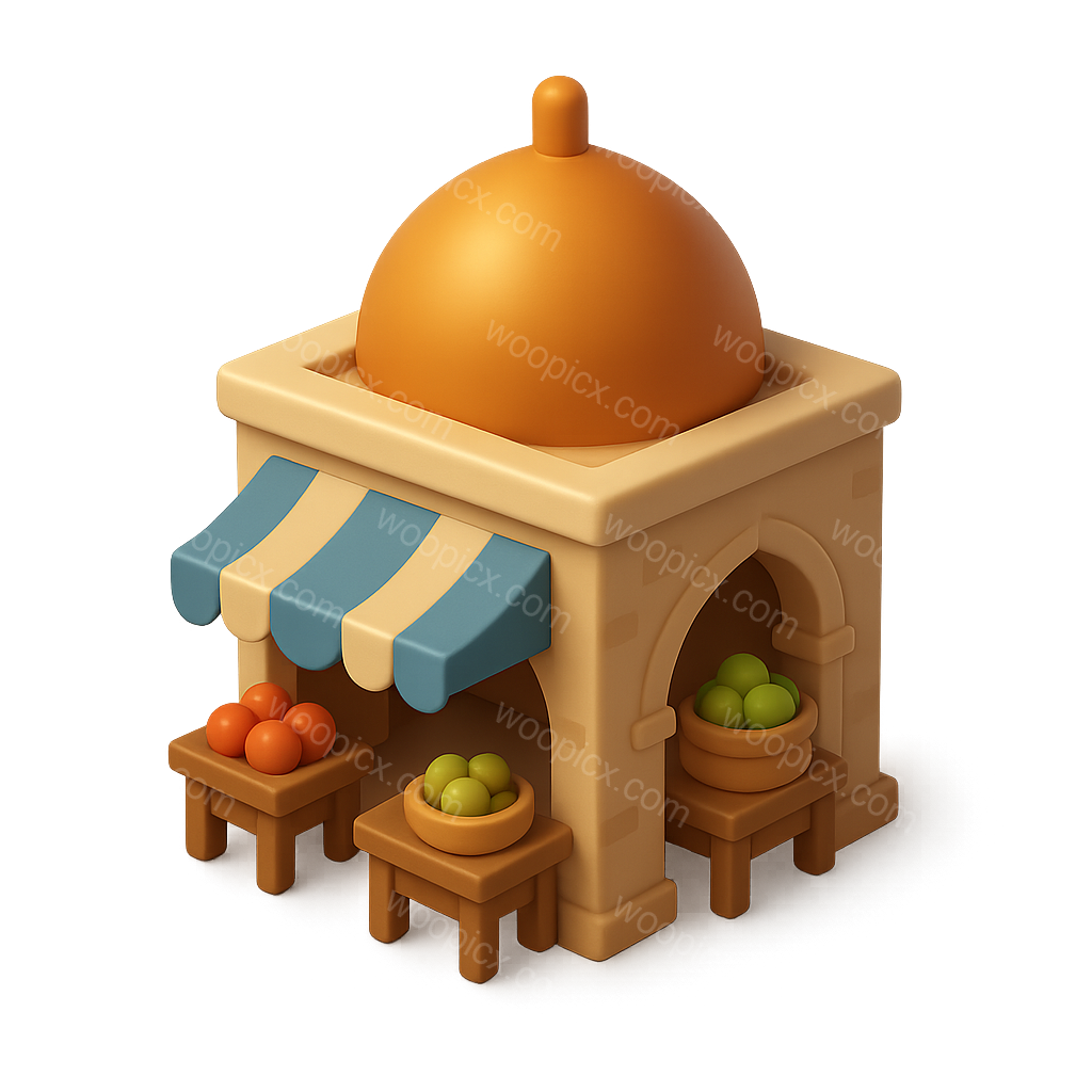 A charming 3D icon of a bazaar market featuring a domed roof and colorful awnings. It showcases fruit stands with oranges and greens, all presented in a three-quarter isometric view.