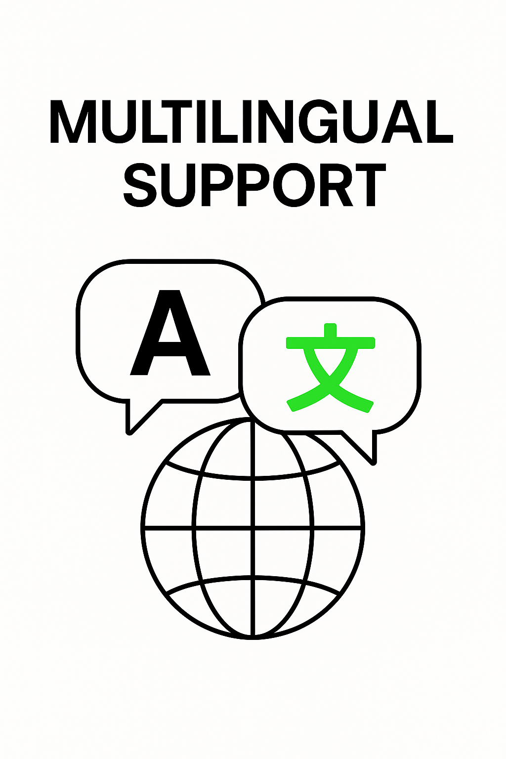 Simple and modern graphic illustrating the concept of multilingual support, featuring speech bubbles and a globe. Ideal for educational or tech-related content.