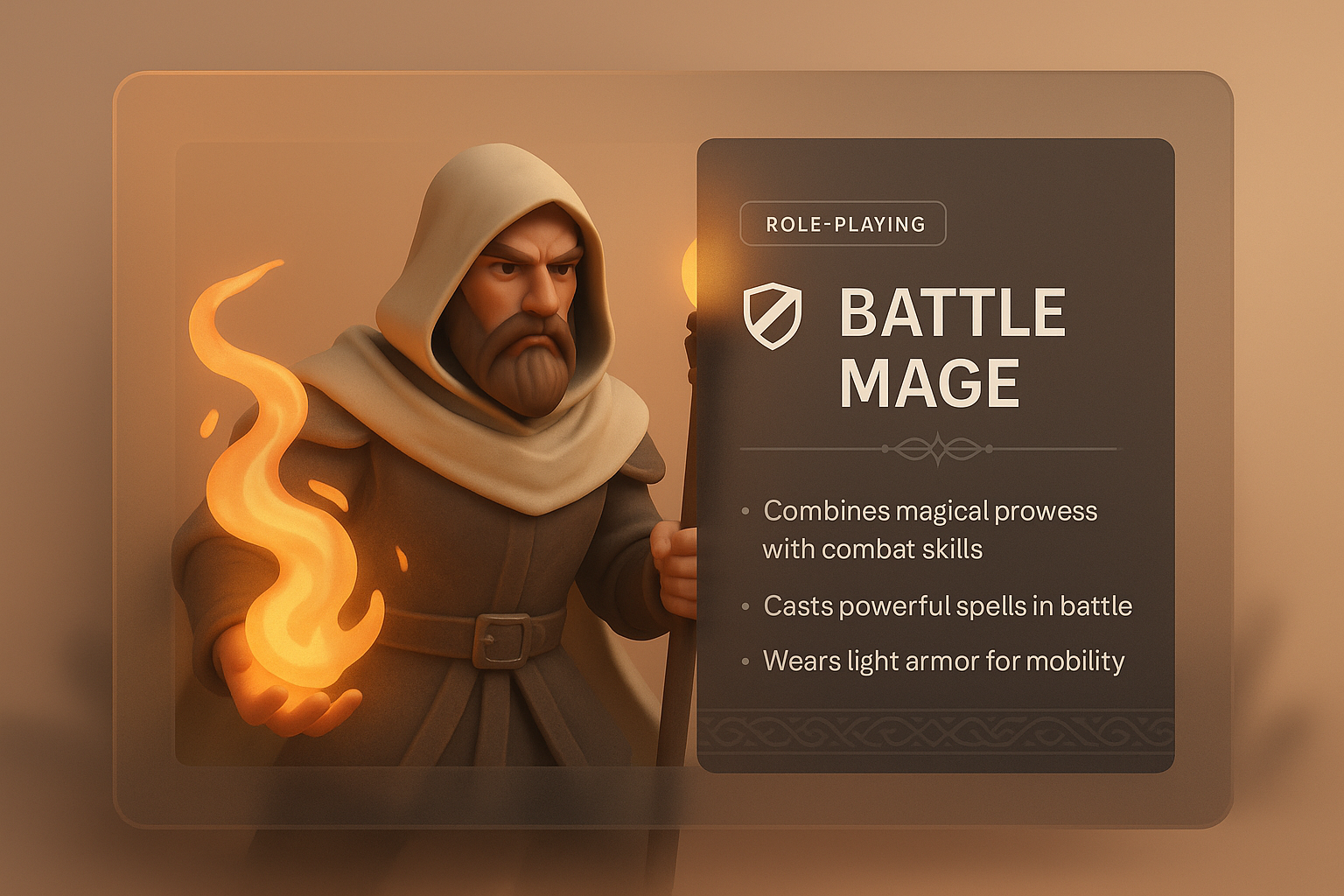 A 3D illustration of a battle mage wielding magical flames. The design features a translucent panel with text blocks that integrate seamlessly into the image.