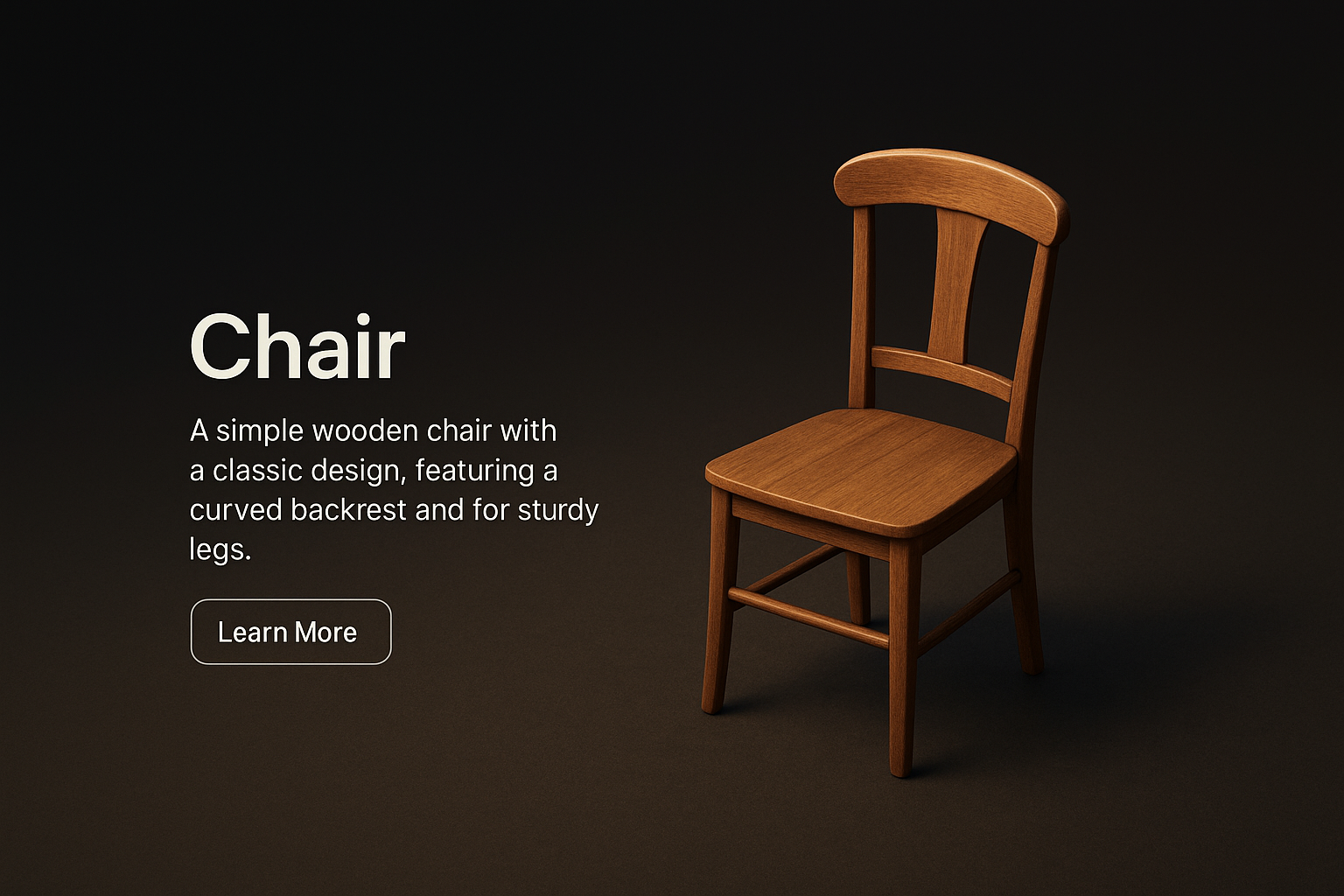 A beautifully rendered 3D model of a classic wooden chair against a dark gradient background. The scene captures a realistic look with a simple design, showcasing the chair's curved backrest and sturdy legs.
