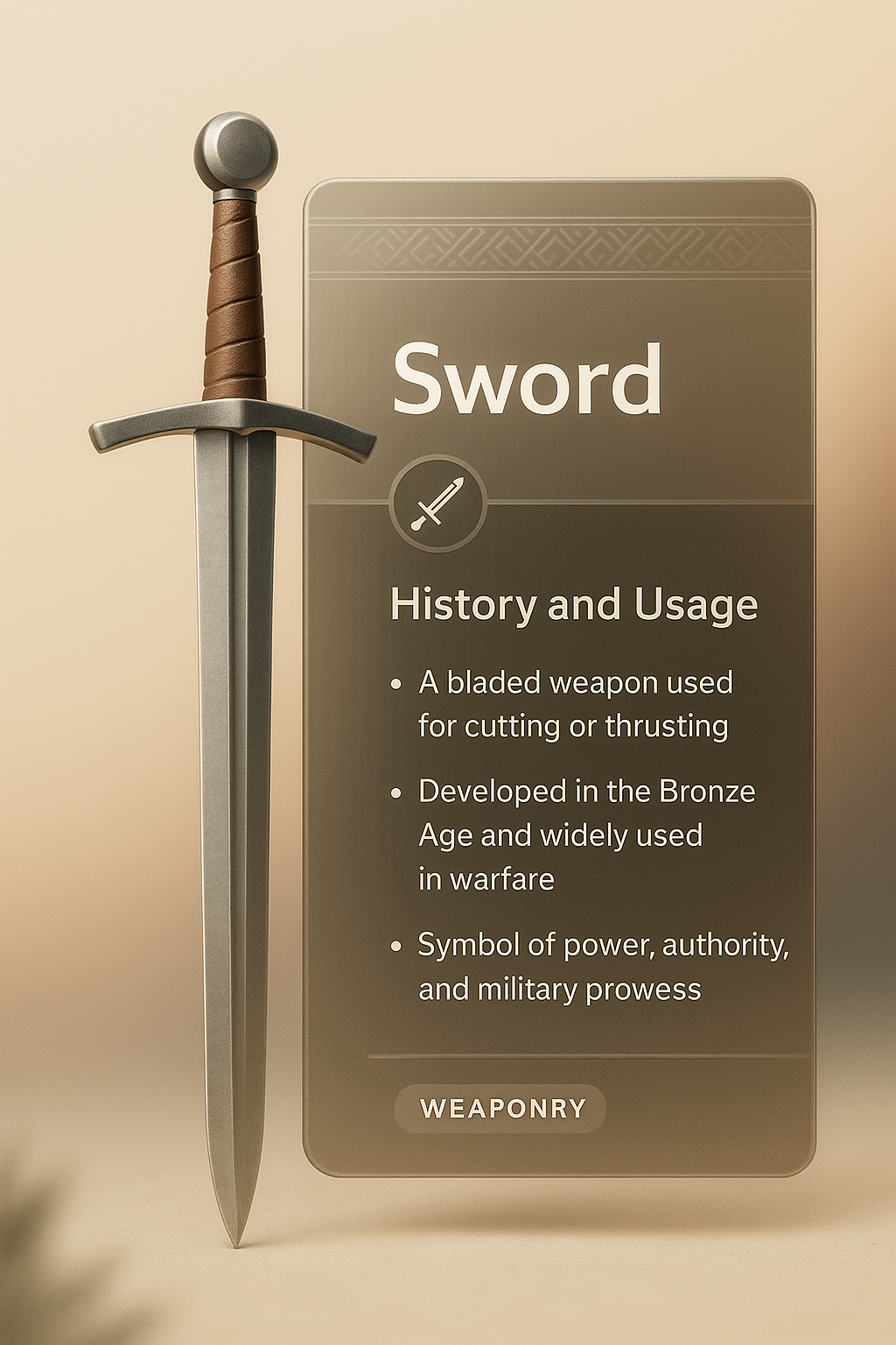 A visually striking 3D illustration of a sword with a transparent panel detailing its history and usage. The background features a smooth gradient, enhancing the overall design.