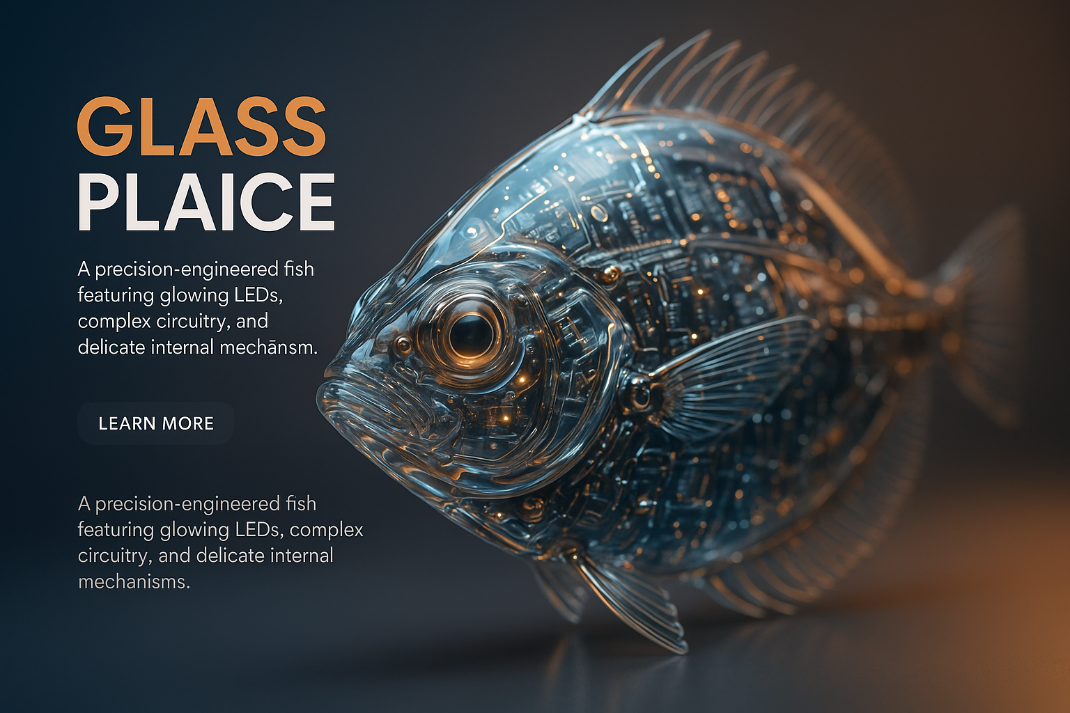 /Collection: /by davooda/Type: PNG/This image showcases a hyperrealistic 3D rendering of a glass plaice fish, featuring intricate details of glowing LEDs and complex circuitry embedded within its transparent surface.
