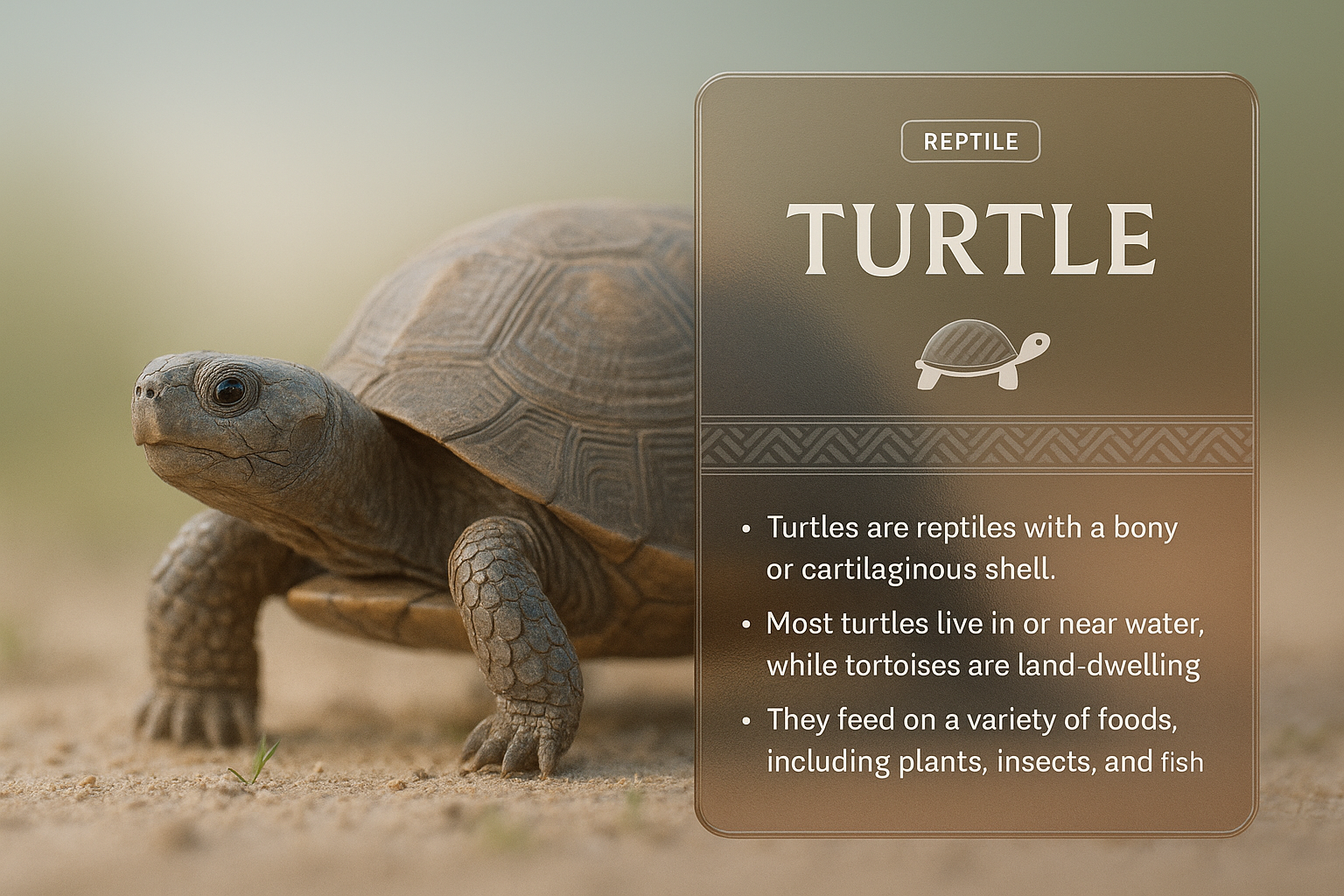 A realistic turtle illustration set against a smooth gradient background, featuring an integrated informative block with text and icons. The design is bright and cohesive.