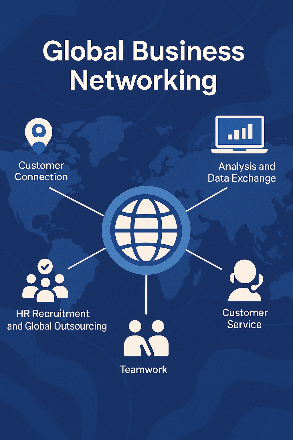 /Collection: /by davooda/Type: PNG/Informative infographic illustrating global business networking concepts with a focus on customer connection, teamwork, and data exchange. Ideal for corporate presentations.
