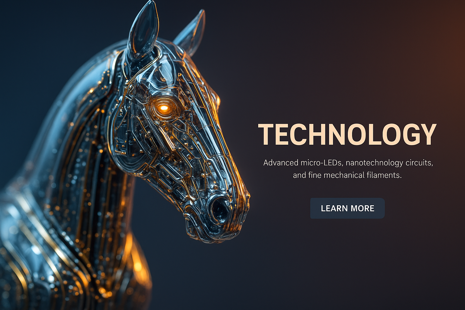 /Collection: /by davooda/Type: PNG/A hyperrealistic depiction of a horse crafted from glass-like polymers, showcasing intricate internal components like micro-LEDs and mechanical filaments. The elegant design reflects ambient light beautifully.