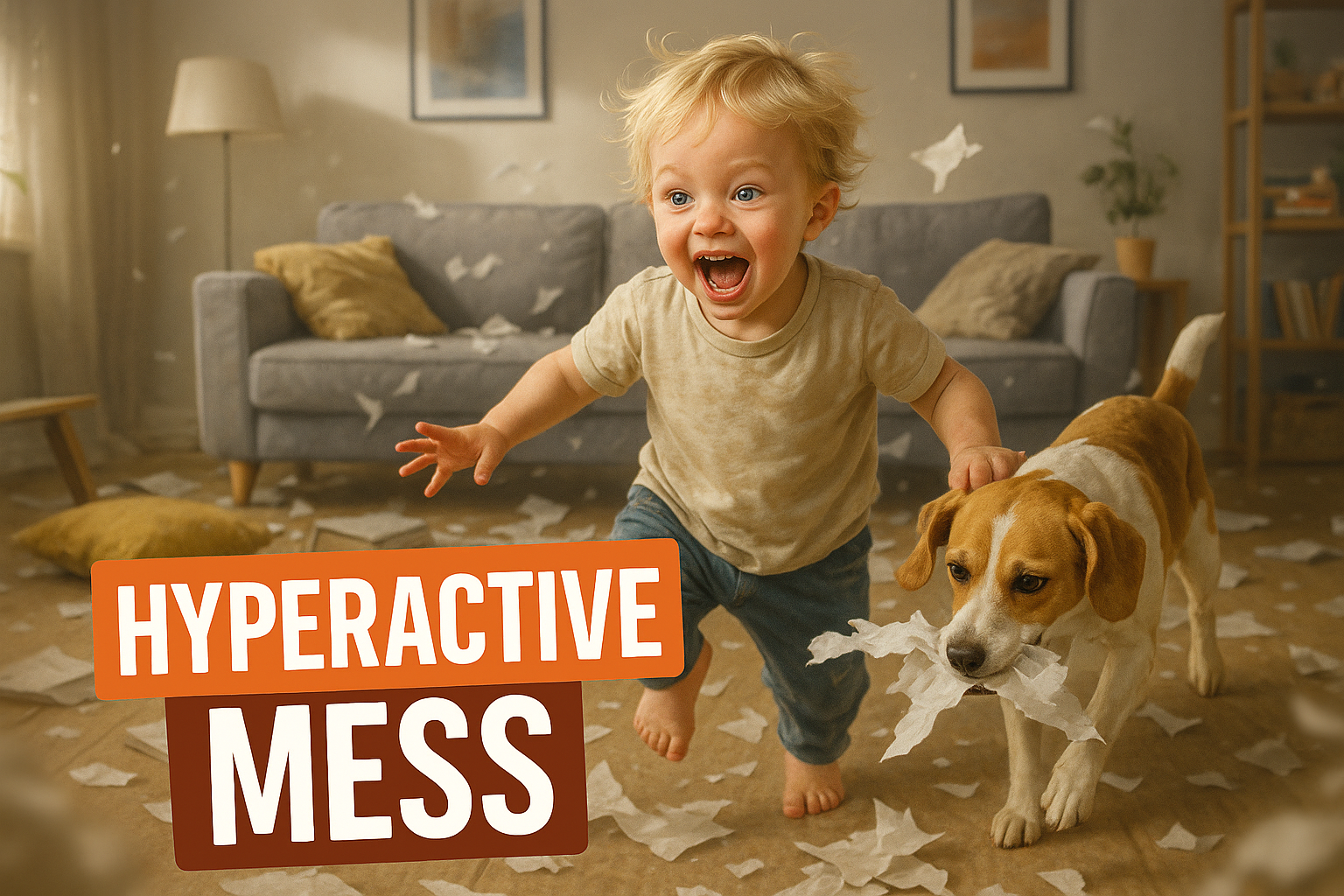 Dynamic image showcasing a joyful child running with a dog amidst a playful mess of paper. Perfect for family-related content, advertising, or social media posts.