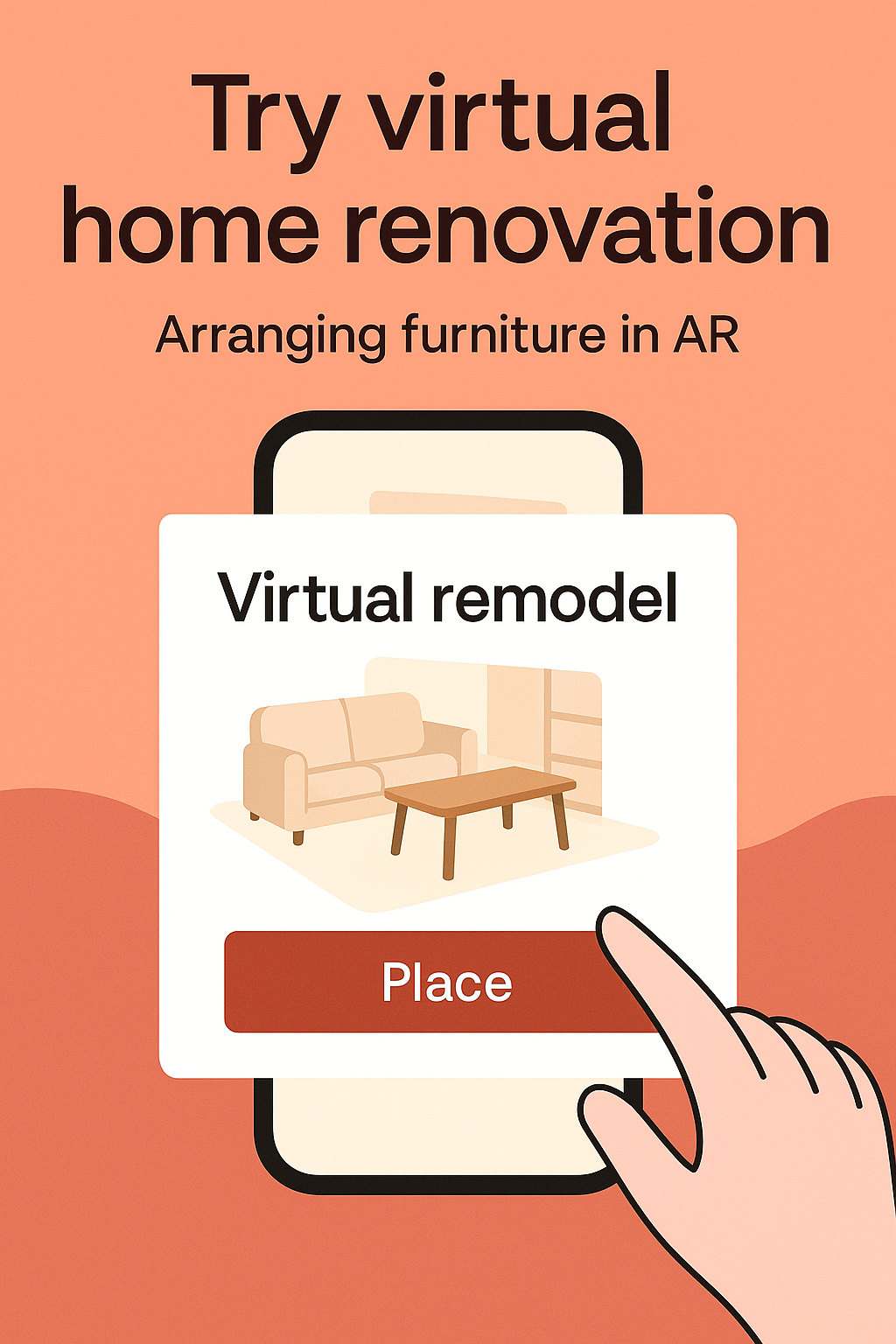 User interface graphic showcasing a virtual home renovation app, featuring furniture placement in augmented reality. Ideal for app promotions and design concepts.