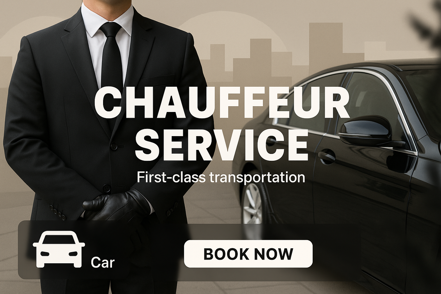 /Collection: /by davooda/Type: PNG/Sleek promotional banner for a chauffeur service featuring a well-dressed chauffeur next to a luxury car, designed to attract high-end clients seeking premium transportation.