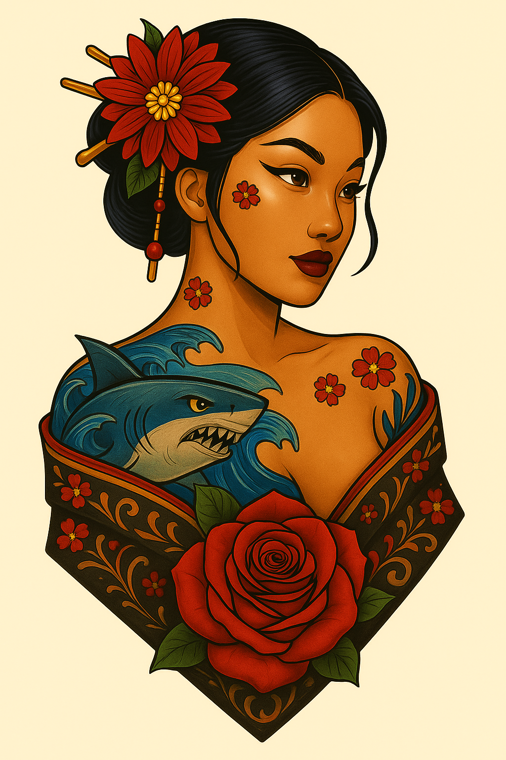 Tattooed Geisha with Rose in Kimono Art Style